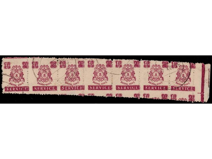 1945 1½a claret horizontal strip of 7 with major perforation error resulting in gradual increase of the height of the stamps ending with the right stamp 7mm taller. Ex. Dan walker collection. 2025 ISES certificate.