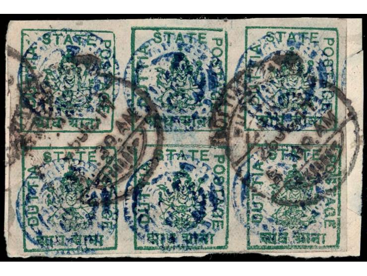 1916 ½a green with control seal in blue, imperforate used block of six with hooded Duttia cancel dated 26 JL 17. This is the largest known used multiple of this stamp. Catalog value as singles £330 ++. 2025 ISES certificate.