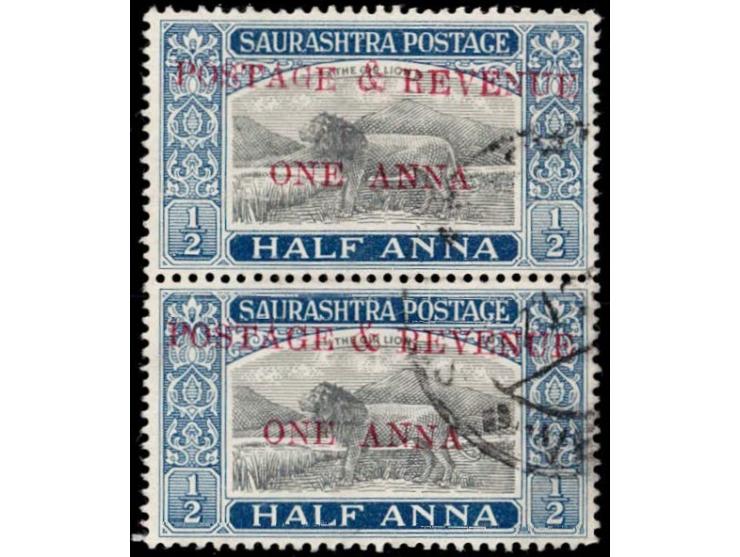 1949 ½a black & deep blue vertical pair surcharged 'POSTAGE & REVENUE / ONE ANNA' with error, small 'G' in POSTAGE on top stamp. This error occurs once in a sheet of 40. Ex. Dr. E.D. Pereira collection.