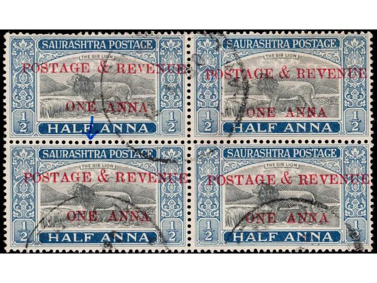 1949 ½a black & deep blue surcharged 'POSTAGE & REVENUE / ONE ANNA' block of four with error, small 'V' and small 'U' in REVENUE on the top left stamp. This error occurs once (Pos. 28) in a sheet of 40. Ex. Dr. E.D. Pereira collection.