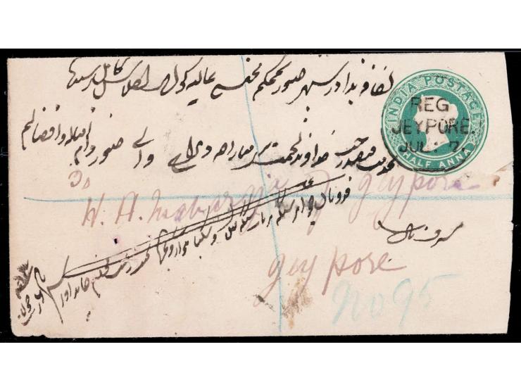 Letter addressed to the King of Jaipur. India Queen Victoria ½ anna postal stationery envelope registered and franked on reverse with 2a orange tied by 'J' in circle of parallel bars with JEYPORE boxed registration strike with '95' with boxed 'TOO LATE'. "H.H. Maharaja of Jeypore" in manuscript on front translating the address written in Urdu.