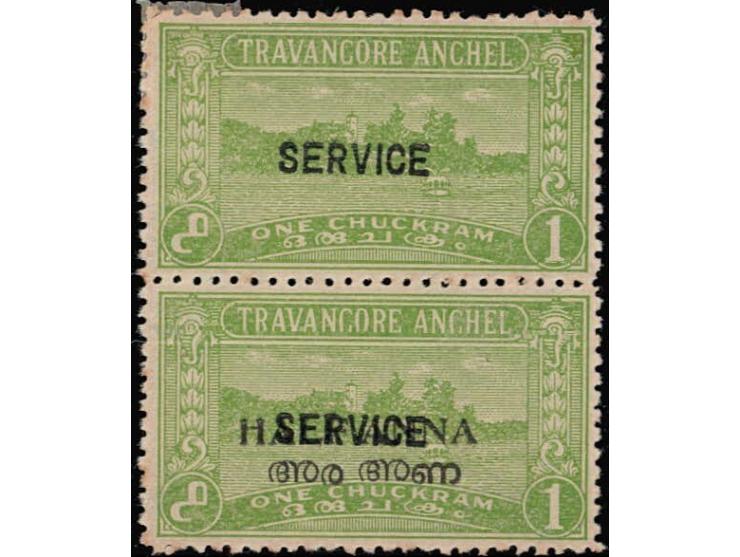 1949-51 vertical pair of ½ anna surcharge on 1ch yellow-green overprinted SERVICE with error, top stamp without surcharge. Unused without gum as issued. 2025 ISES certificate.