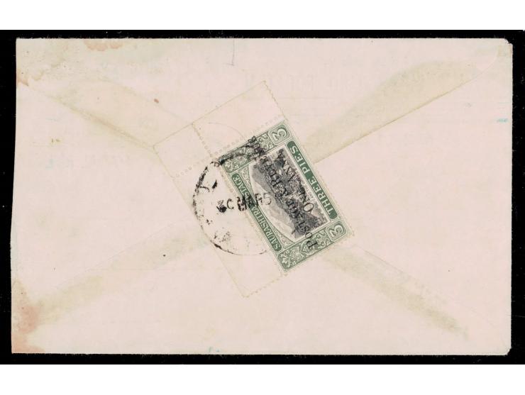 30 March 1950 cover franked on reverse with 1950 3p black & blackish green surcharged 'POSTAGE & REVENUE / ONE ANNA' corner marginal copy tied by 30 March 1950 cds. This is the last day of use as the United States of Saurashtra postal service was incorporated into that of India on 30 March 1950. An important item of Soruth postal history.