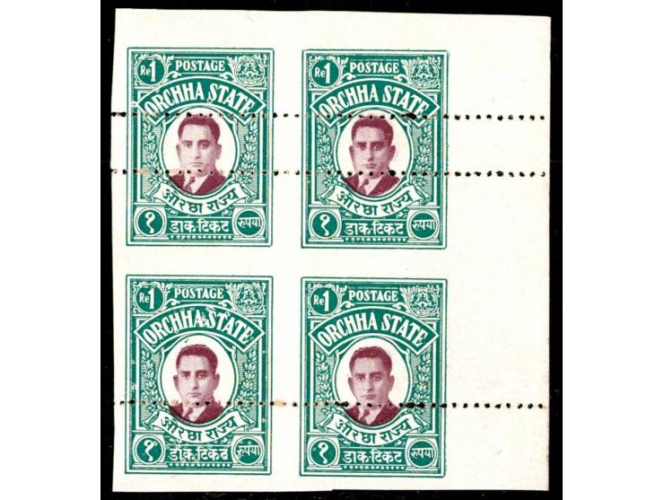 1935 1r chocolate & myrtle-green imperf block of four with three rows of misplaced horizontal perforations. 2025 ISES certificate.