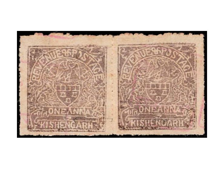 1948-49 Kishangarh 1a brown-lilac pin-perf overprinted RAJASTHAN in red, horizontal pair. Unused without gum as issued with some toning.