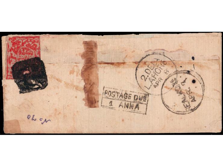 1867 ½a red in watercolor on native paper used on cover from Jammu to Lahore (present day Pakistan) tied by square intaglio seal cancel. The cover bears a 1 anna boxed postage due strike because the ½a Imperial postage was not prepaid resulting postage due being levied at twice the deficiency. With Sialkot transit cds and Lahore delivery cds.