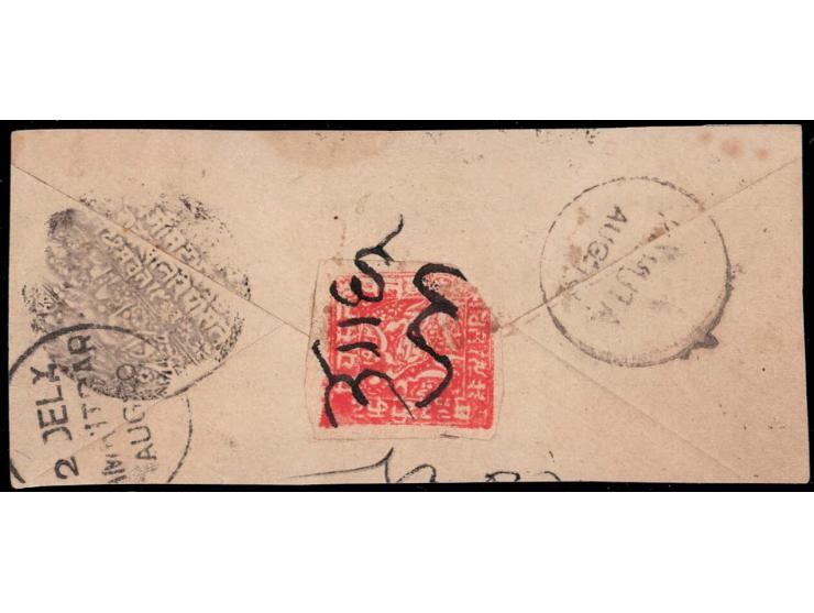 1876 6p red on yellowish white wove paper used on part cover tied by manuscript cancel, stamp with corner missing, with Poonch native 4 line intaglio seal cancel, Kahuta transit cds and Amritsar delivery cds. Catalog value of stamp alone is £300