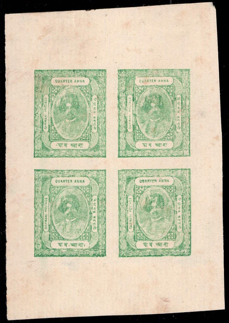 1921 ¼a green clear impression on vertically laid batonne paper imperf sheet of four. Unused without gum as issued