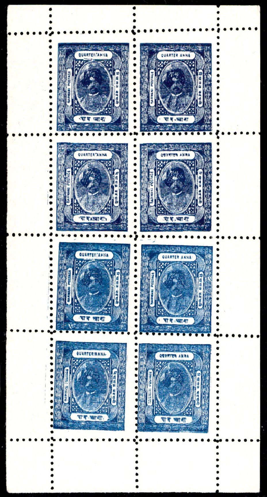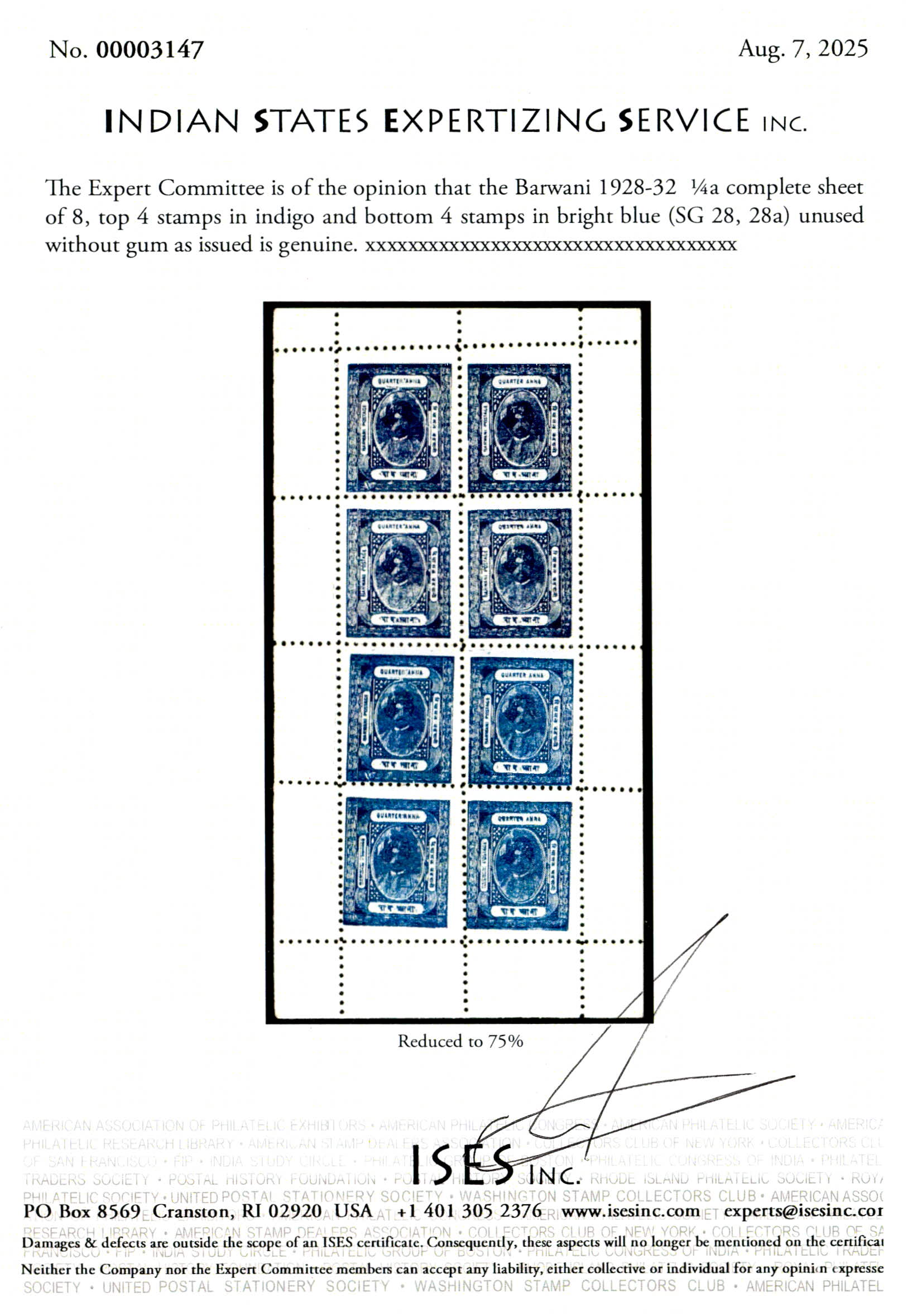 1929-32 ¼a complete sheet of 8, top 4 stamps in indigo and bottom 4 stamps in bright blue. A spectacular sheet printed in two colors. Unused without gum as issued. 2025 ISES certificate