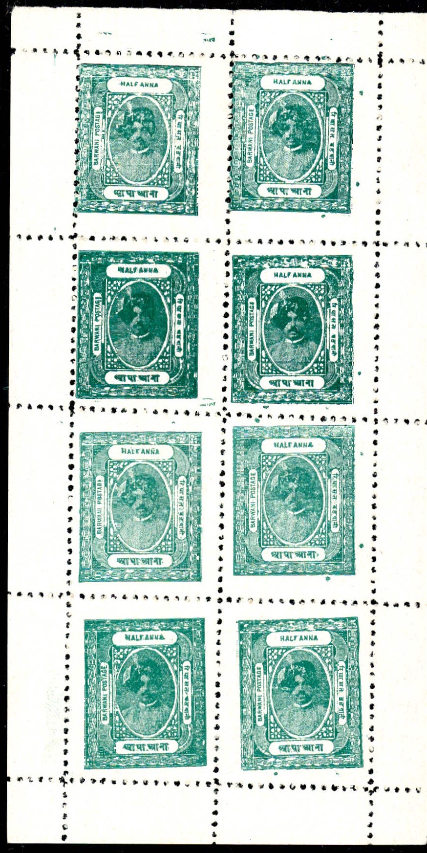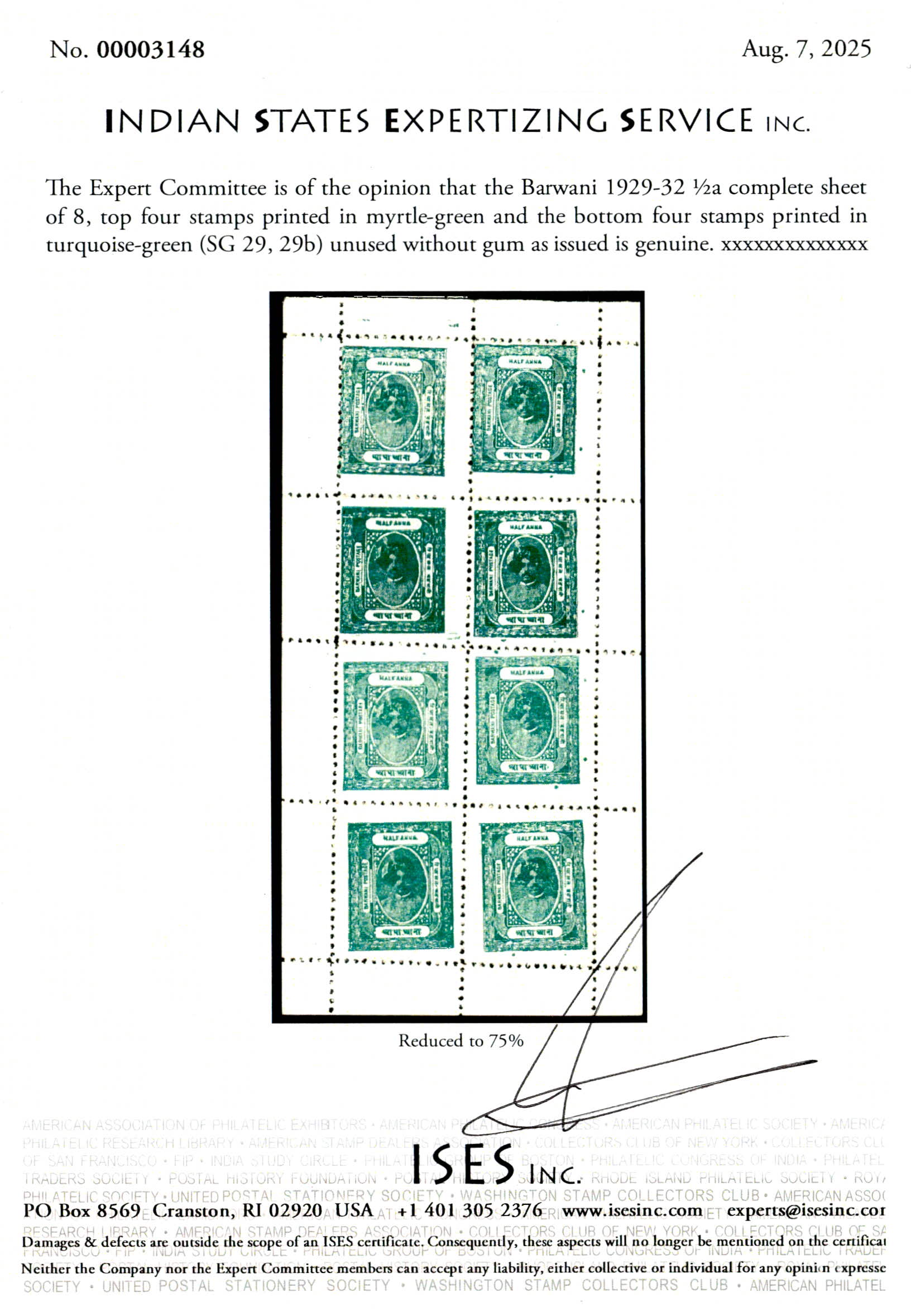 1929-32 ½a complete sheet of 8, top four stamps printed in myrtle-green and the bottom four stamps printed in turquoise-green. A spectacular item. Unused without gum as issued. 2025 ISES certificate