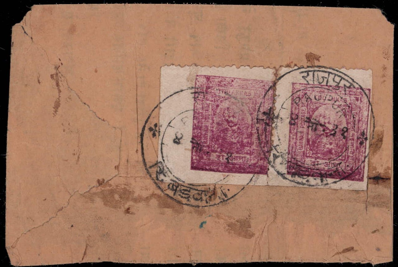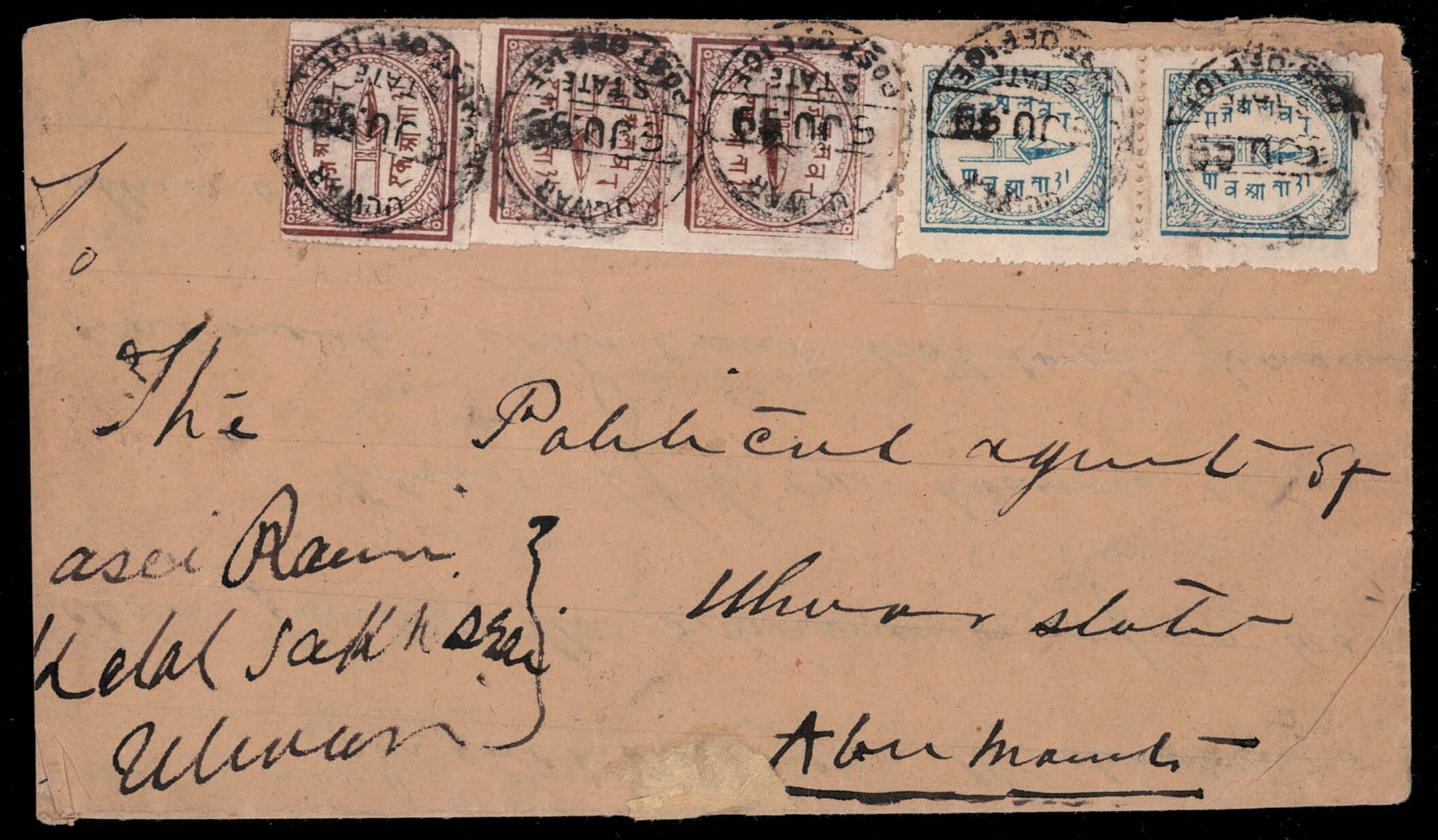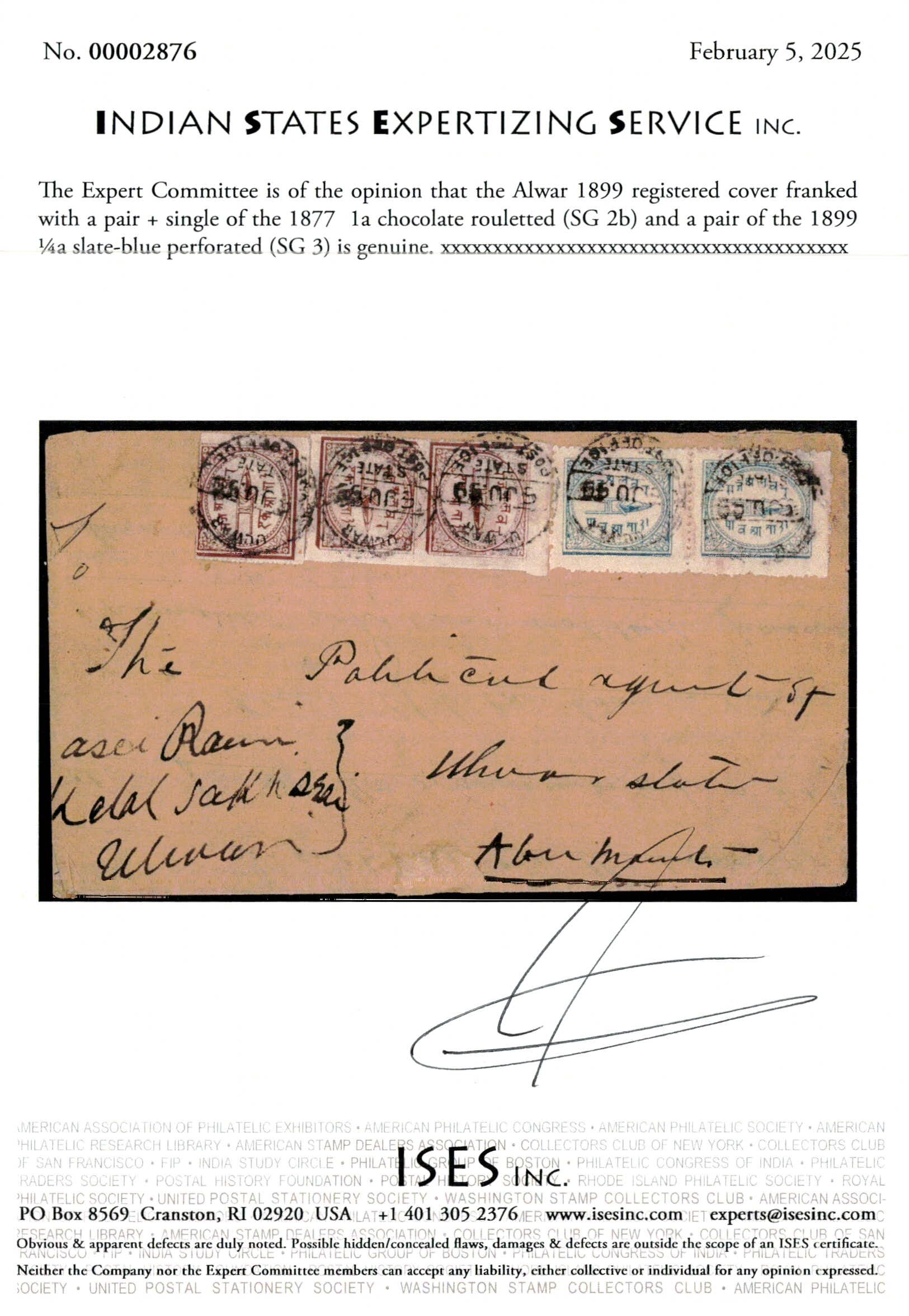 1899 registered cover franked with a pair + single of the 1877 1a chocolate rouletted and a pair of the 1899 ¼a slate-blue perforated all tied by 'ULWAR STATE / POST OFFICE / 5 JU 99' cds with 'ULWAR STATE / POST OFFICE / 6 JU 99' delivery cds on reverse. Very late usage of the 1a stamp and the first mixed franking of bot the perforated and rouletted issue that we have handled in 40 years. Ex. Bill Tatham collection. 2025 ISES certificate.