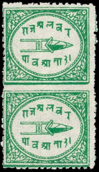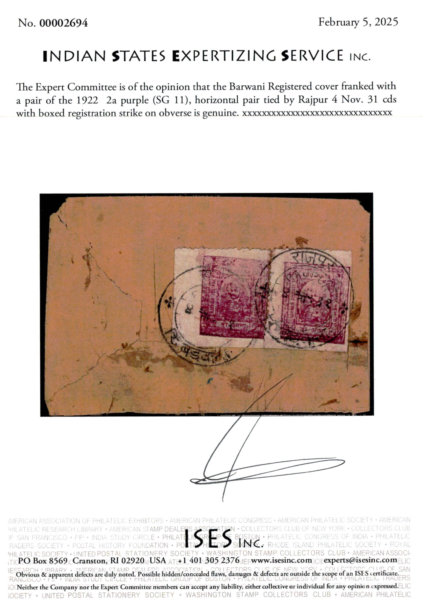 Registered cover franked with a pair of the 1922 2a purple horizontal pair tied by Rajpur 4 Nov. 31 cds with boxed registration strike on obverse. 2025 ISES certificate.
