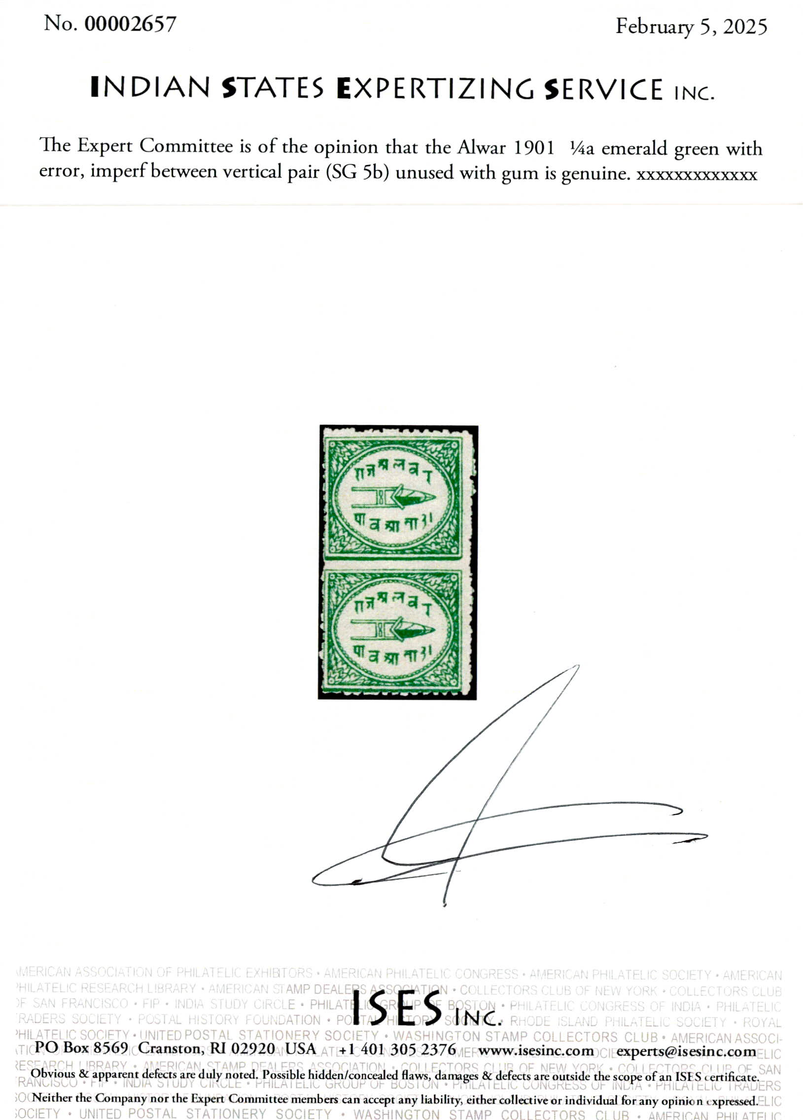 1901 ¼a emerald green with error, imperf between vertical pair. 2025 ISES certificate.