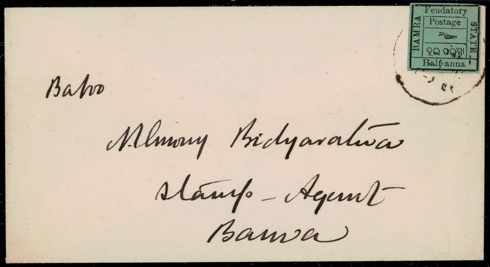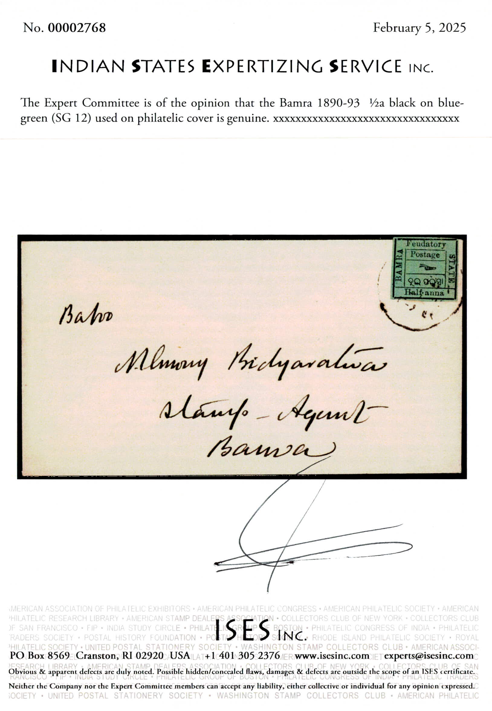 1890-93 ½a black on blue-green on locally addressed philatelic cover. Covers bearing Bamra stamps are extremely rare. 2025 ISES certificate.