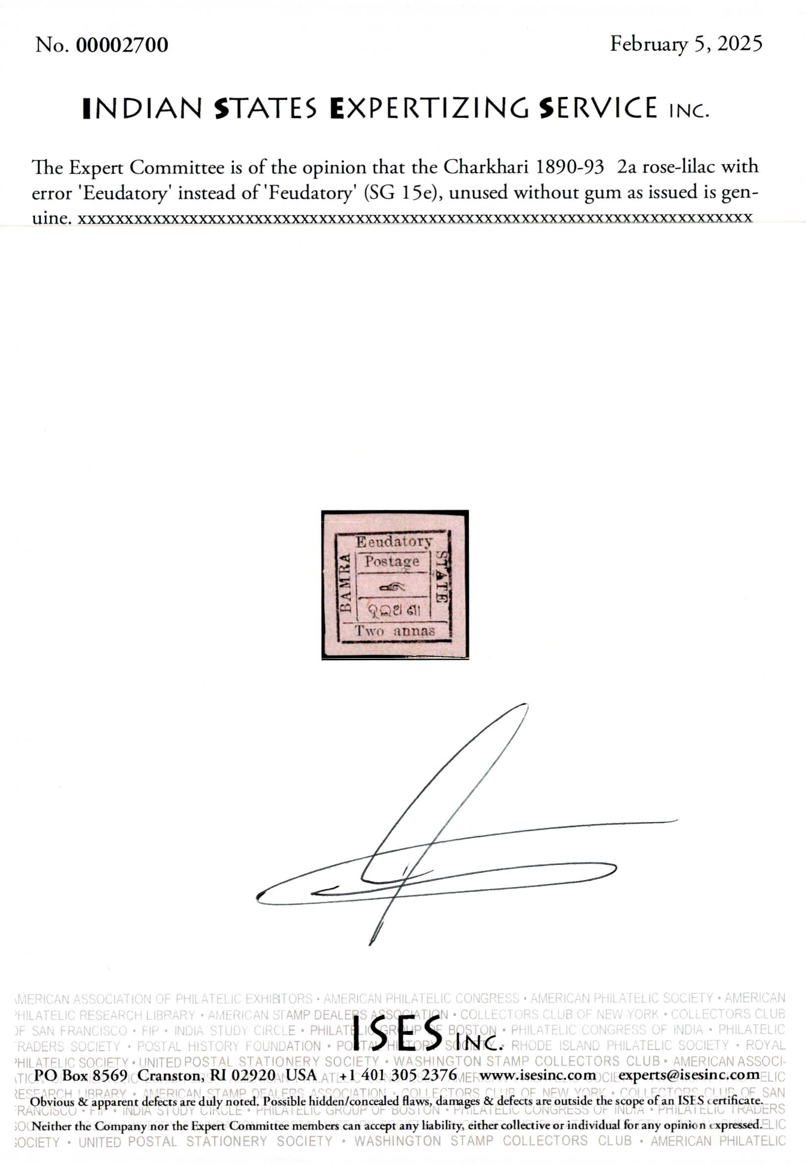 1890-93 2a rose-lilac with error 'Eeudatory' instead of 'Feudatory'. Unused without gum as issued. 2025 ISES certificate.