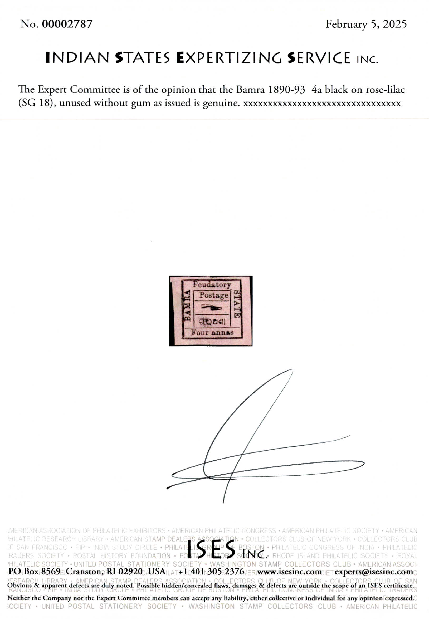 1890-93 4a black on rose-lilac. Thin in a couple of spots. An elusive stamp. Unused without gum as issued. 2025 ISES certificate.