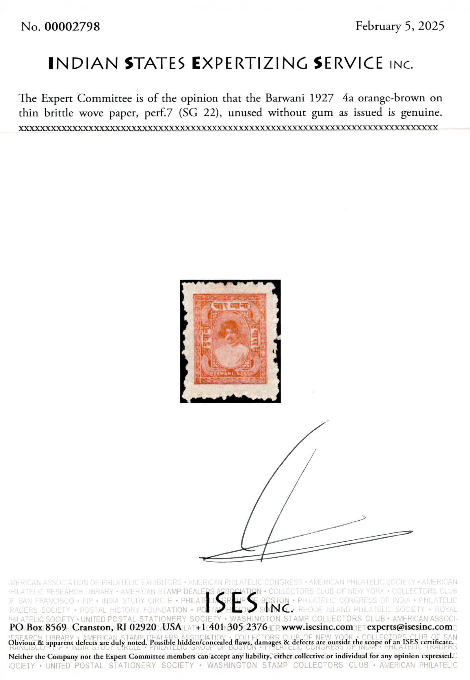 1927 4a orange-brown on thin brittle wove paper, perf.7. Unused without gum as issued. 2025 ISES certificate.