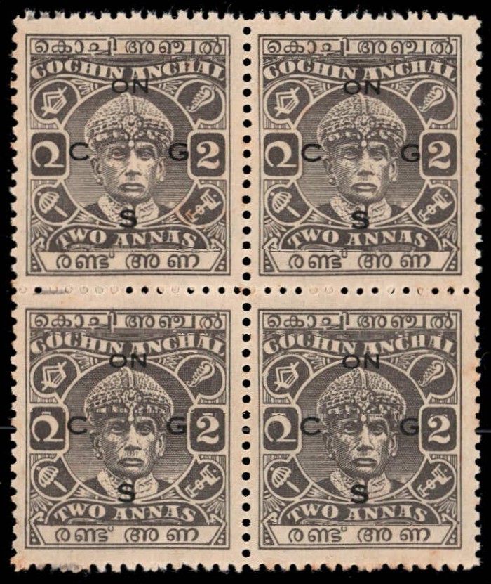 1943 2a grey-black perf. 11 overprinted ON C G S. MNH block of 4 with minor stains