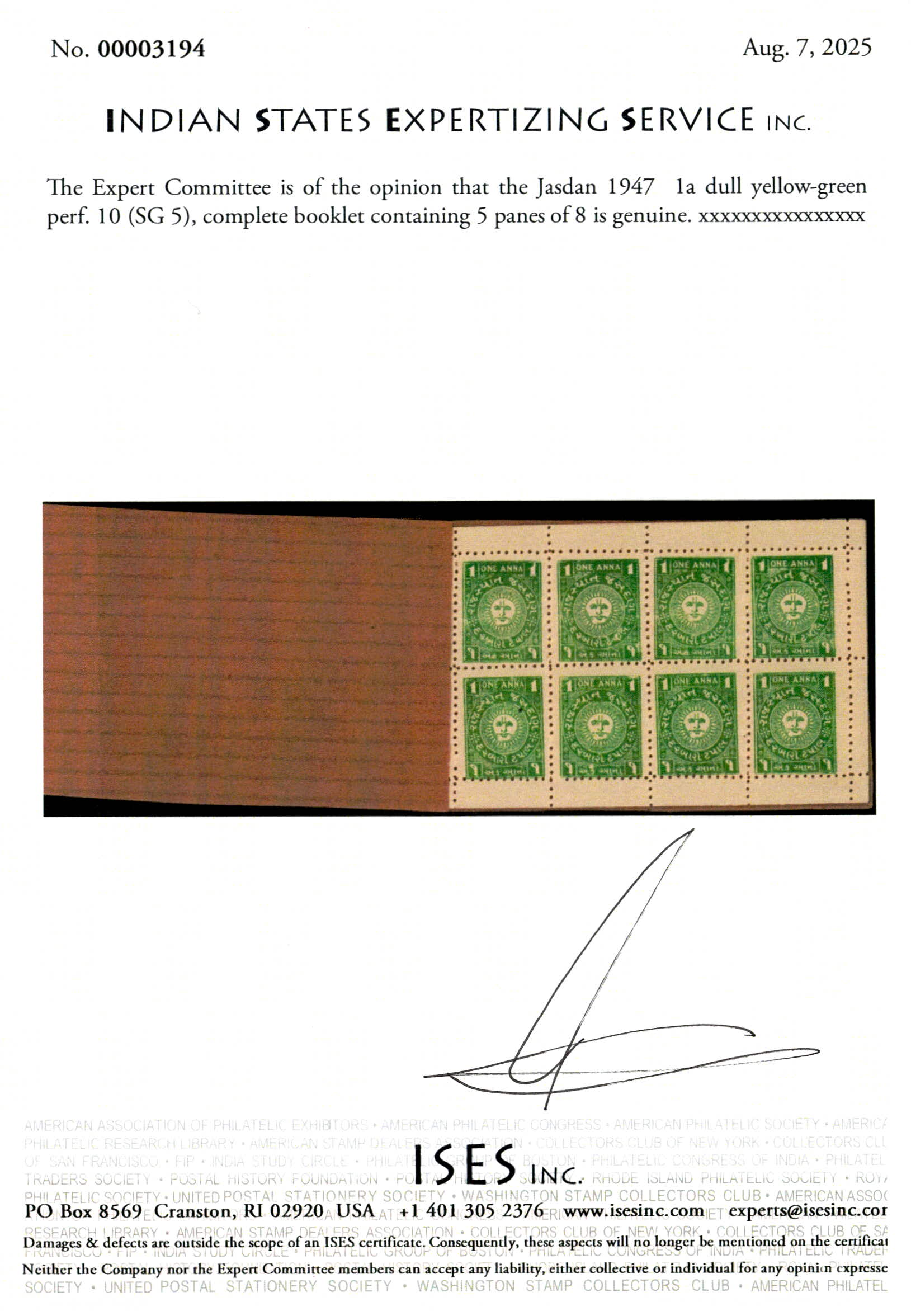 1947 1a dull yellow-green perf. 10 complete booklet containing 5 booklet panes of 8 in fine condition. This is the only recorded booklet of SG 5. Catalog value as single stamps £2000. 2025 ISES certificate