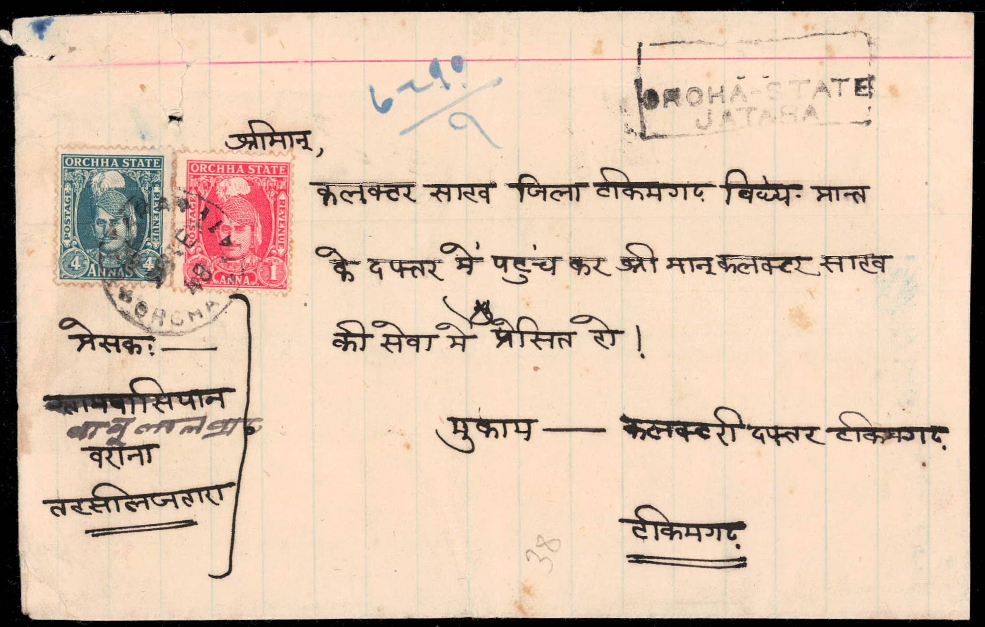 1939 1a & 4a on registered cover from Jatara to Tikamgarh