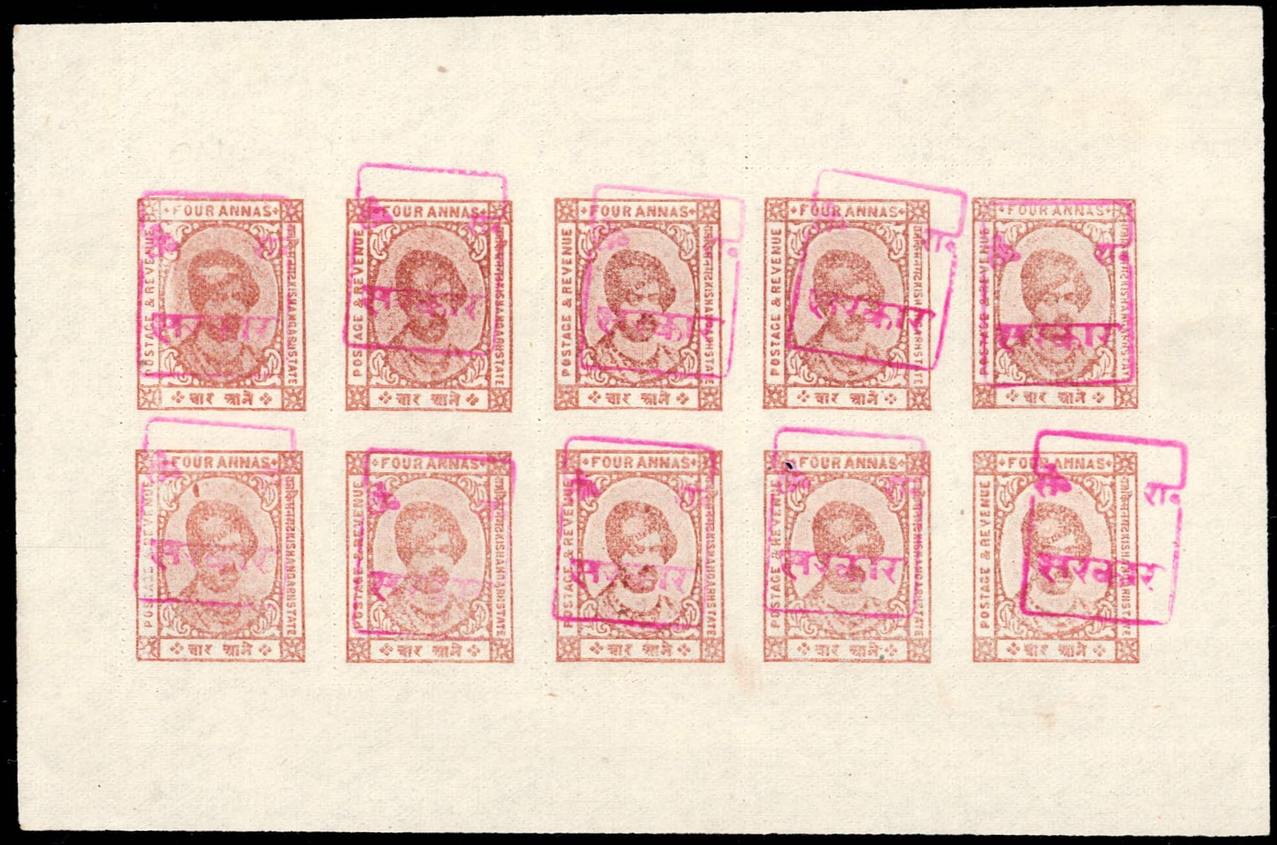 1948-49 Kishangarh 4a brown complete sheet of 10 overprinted RAJASTHAN in red. Unused without gum as issued