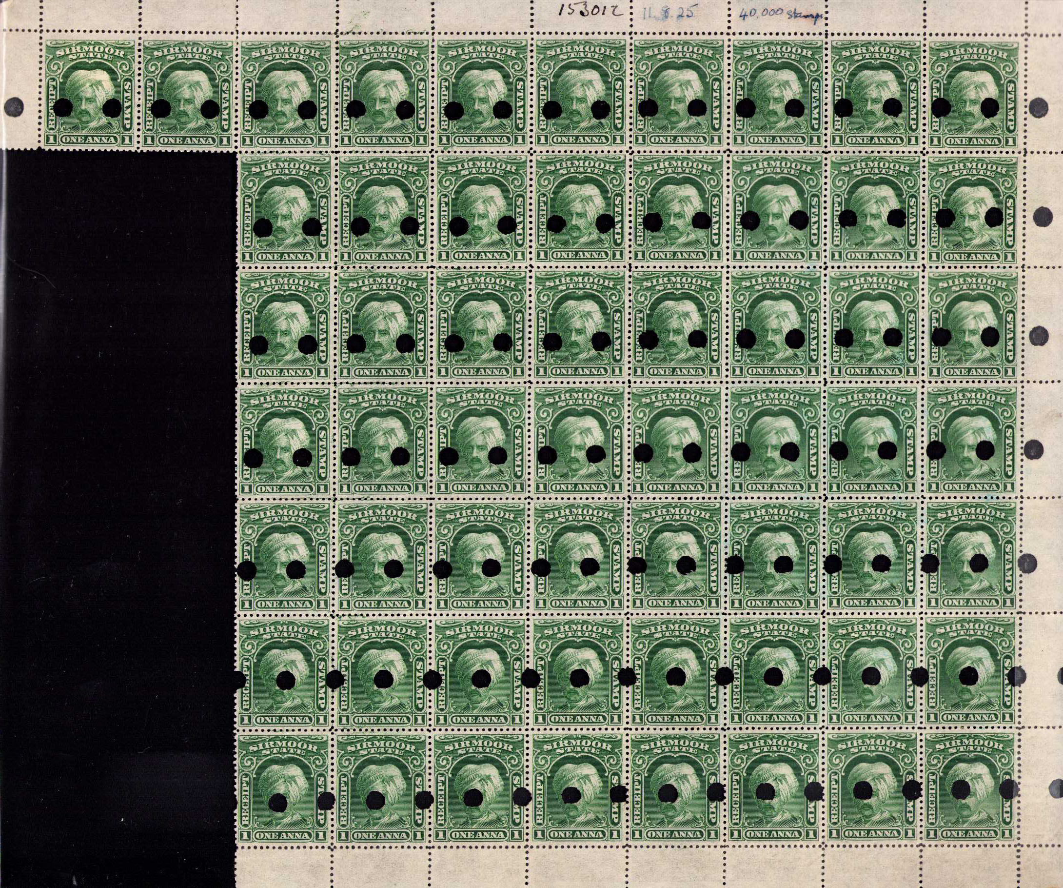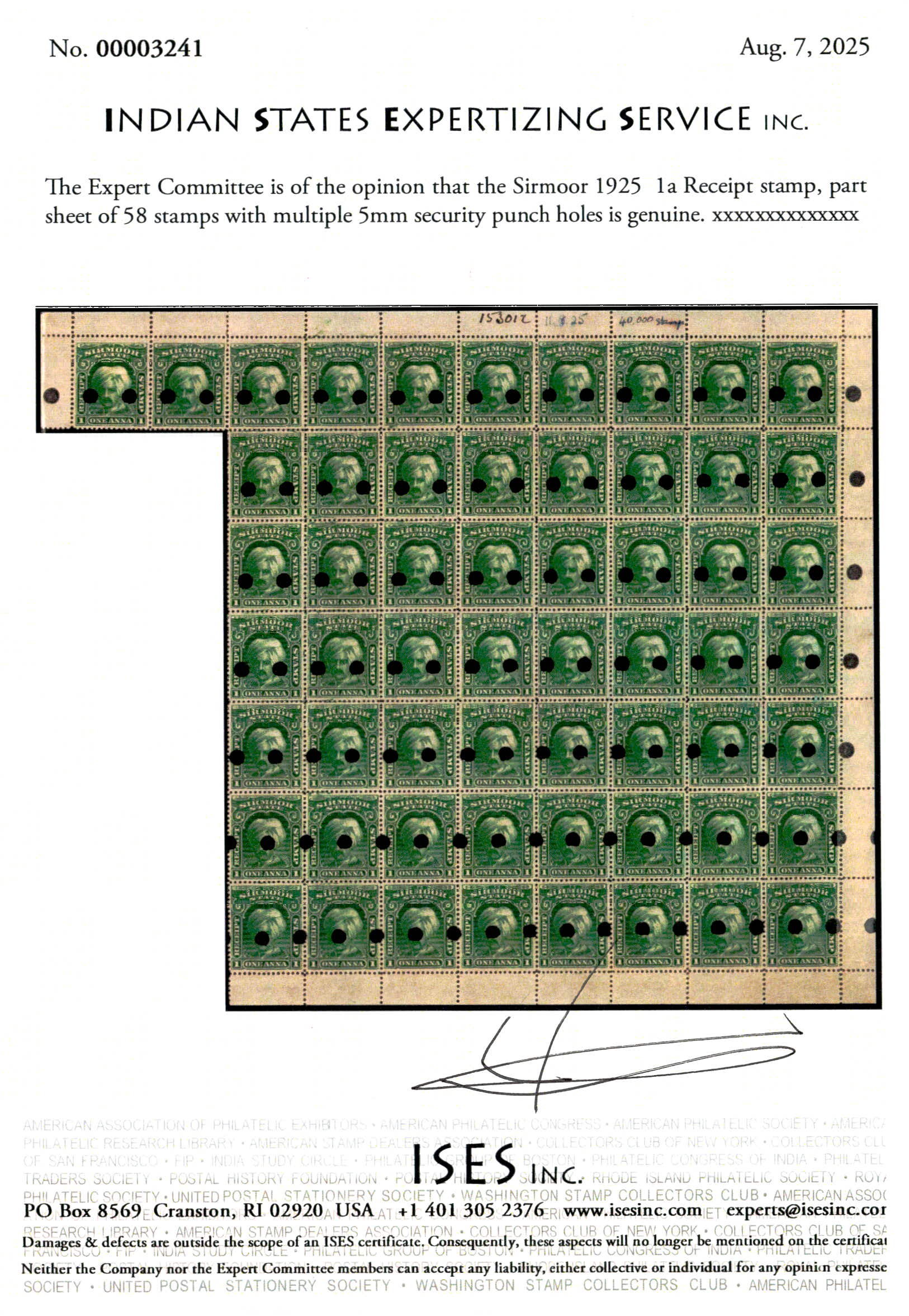 1925 1a Receipt stamp, part sheet of 58 stamps from the Waterlow archive with manuscript annotation on margin "153012", "11.8.25" and "40,000 stamps" all stamps with multiple 5mm security punch holes. Unique 2025 ISES certificate
