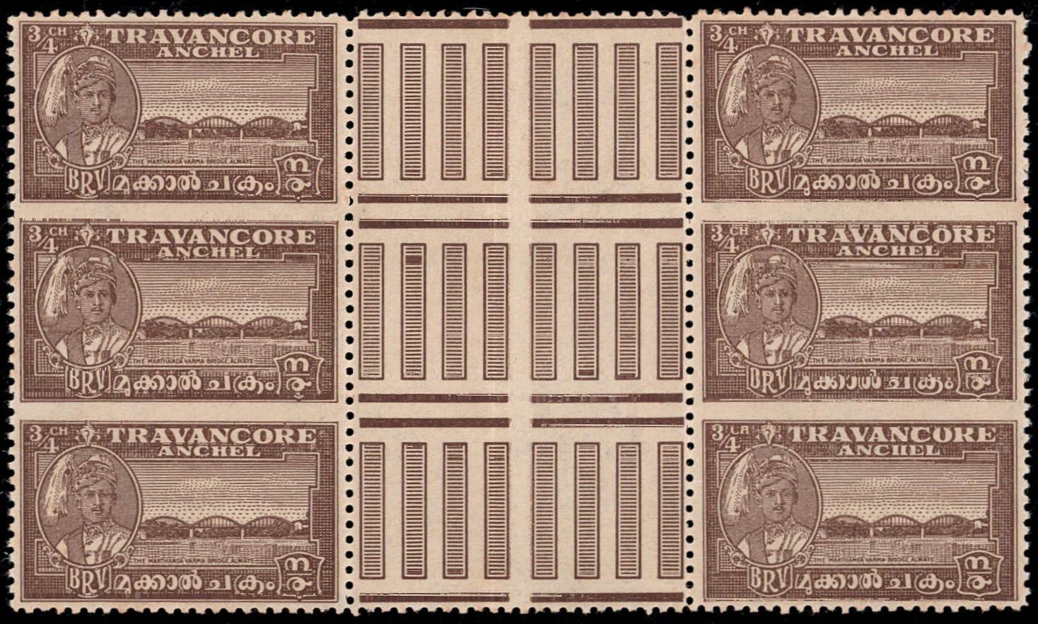 1941 ¾ch brown perf. 11 block of 6 with middle gutter with error, imperf between vertical strip of three x 2
