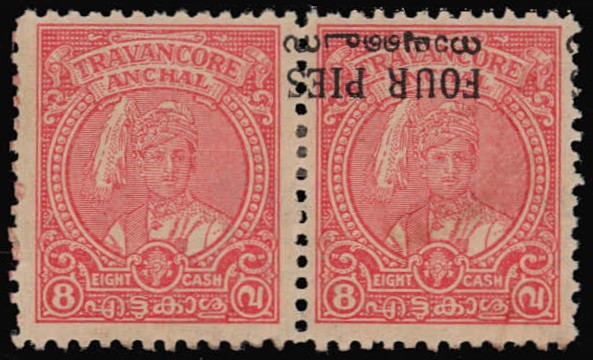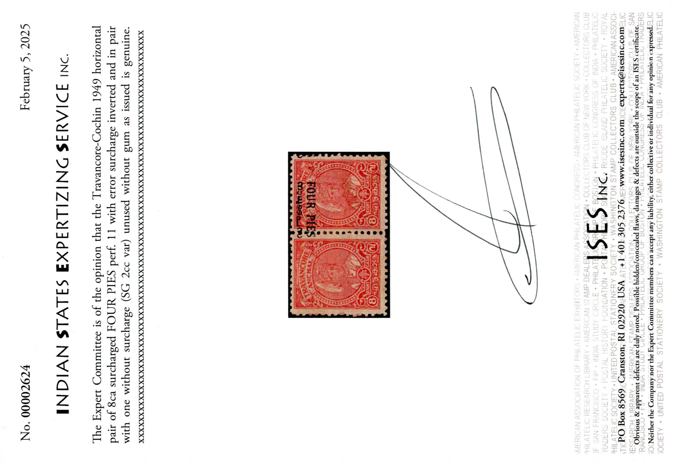 1949 horizontal pair of 8ca surcharged FOUR PIES perf. 11 with error surcharge inverted and in pair with one without surcharge. Note that both errors (inverted surcharge) and (pair, one without surcharge) are listed but the combination of both errors is not listed in SG catalog. As such, possibly unique. With Jal Cooper's initials in pencil on reverse. Unused without gum as issued. 2025 ISES certificate.