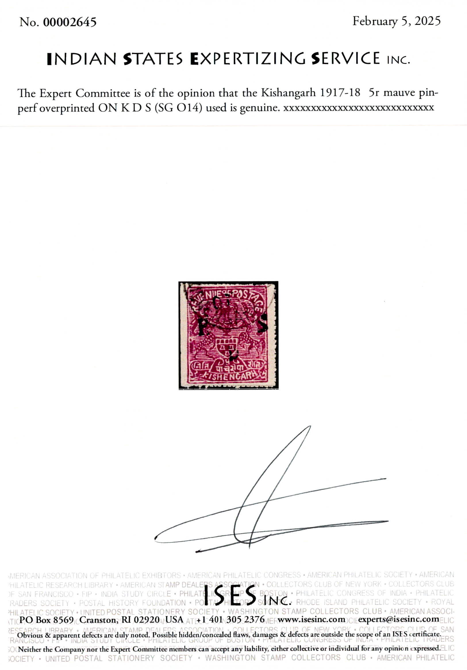 1917-18 5r mauve overprinted ON K D S. This is the first example we have handled in 40 years. 2025 ISES certificate.