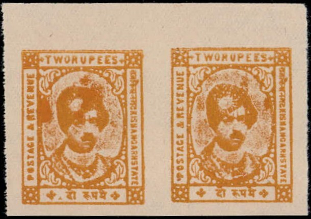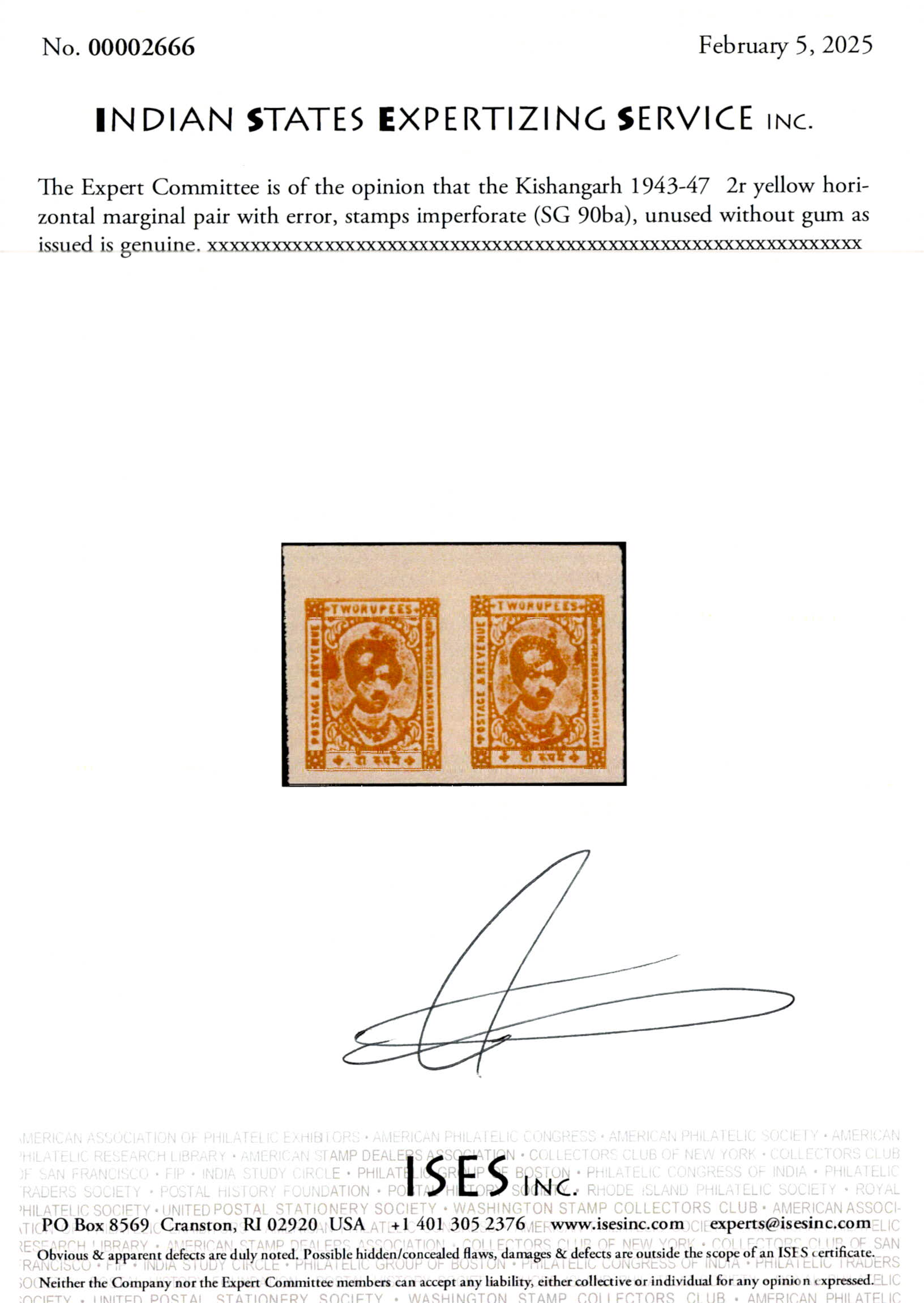 1943-47 2r yellow horizontal marginal pair with error, stamps imperforate. Unused without gum as issued. 2025 ISES certificate.