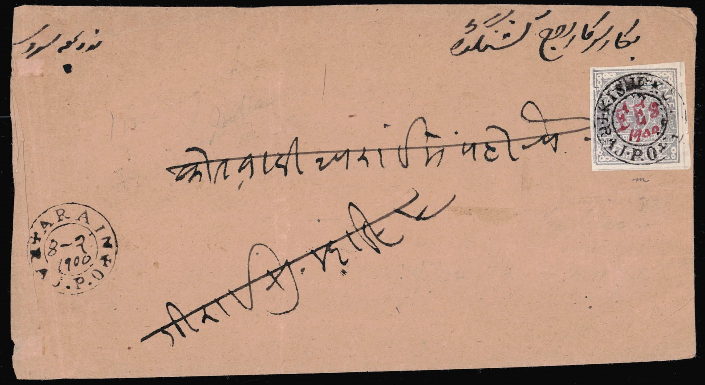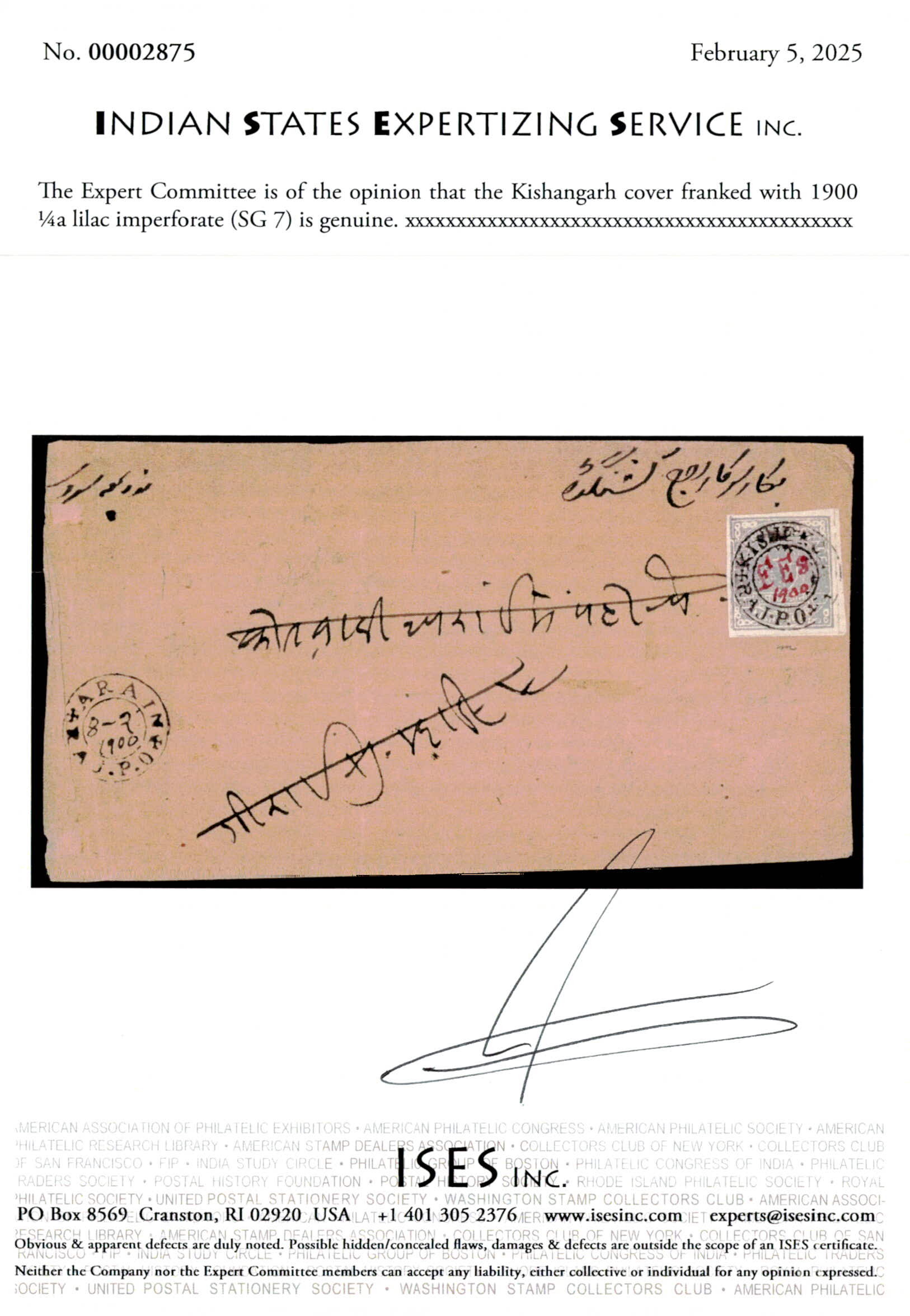 Local cover from Kishangarh to Arain franked with1900 ¼a lilac imperforate cancelled by 'KISHANGARH / RAJ.P.O.' double circle cancel with 'FE 8 / 1900' in red manuscript with 'ARAIN / RAJ.P.O' and manuscript '8-2-1900' delivery cancel. This is the first example we have seen of this stamp on cover. 2025 ISES certificate.