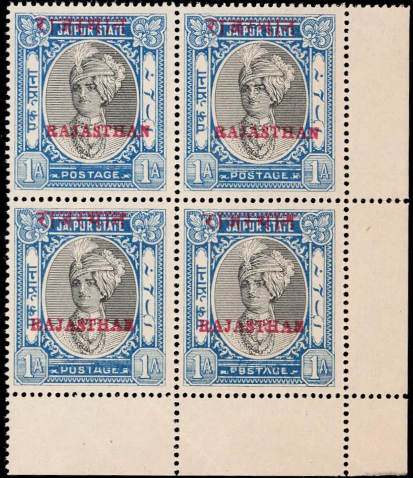 1950 Jaipur 1a black & blue overprinted RAJASTHAN, right corner marginal block of four, gum slightly toned.