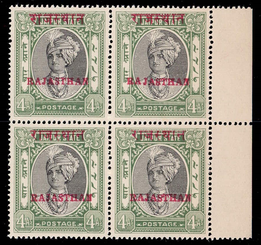 1950 Jaipur 4a black & grey-green overprinted RAJASTHAN, right marginal block of four, gum slightly toned.