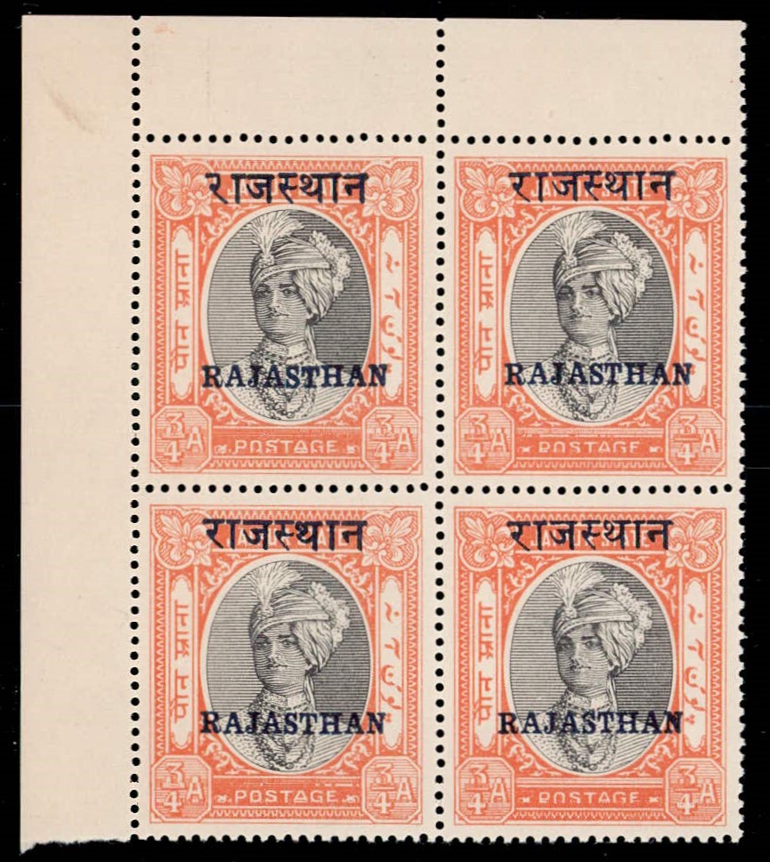 1950 Jaipur ¾a black & brown-red overprinted RAJASTHAN, top left marginal block of four, gum slightly toned.
