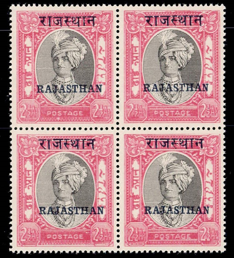 1950 Jaipur 2½a black & carmine overprinted RAJASTHAN, block of four, gum slightly toned.