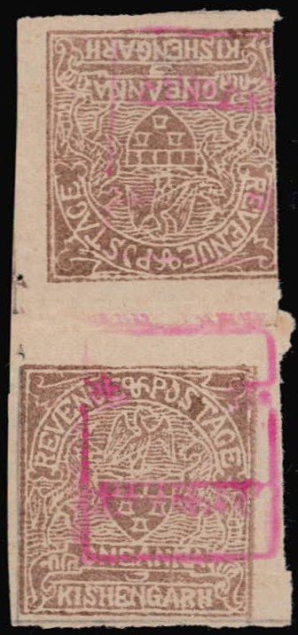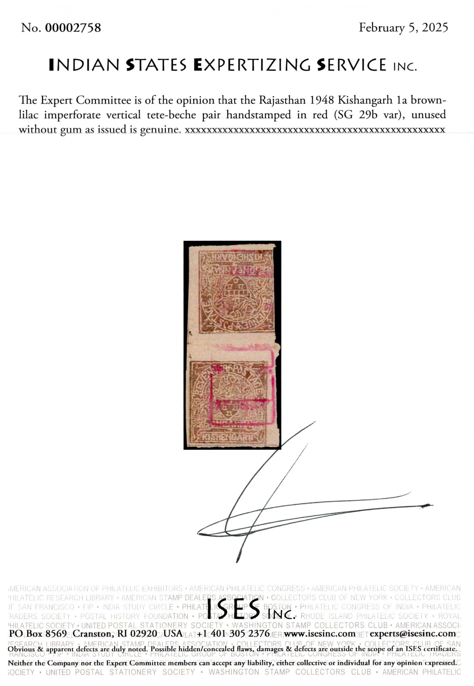 1948 Kishangarh 1a brown-lilac imperforate vertical tete-beche pair handstamped in red. Unused without gum as issued. 2025 ISES certificate.