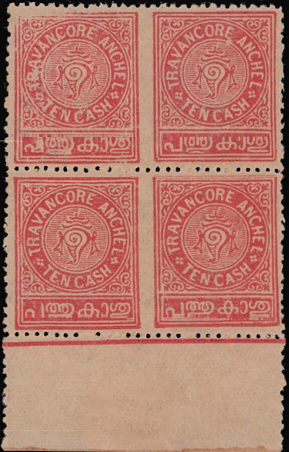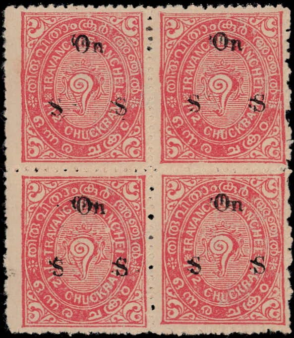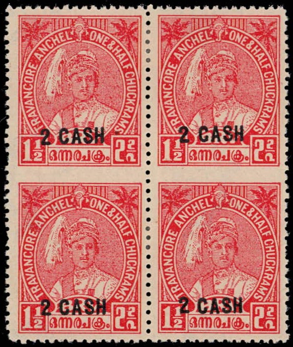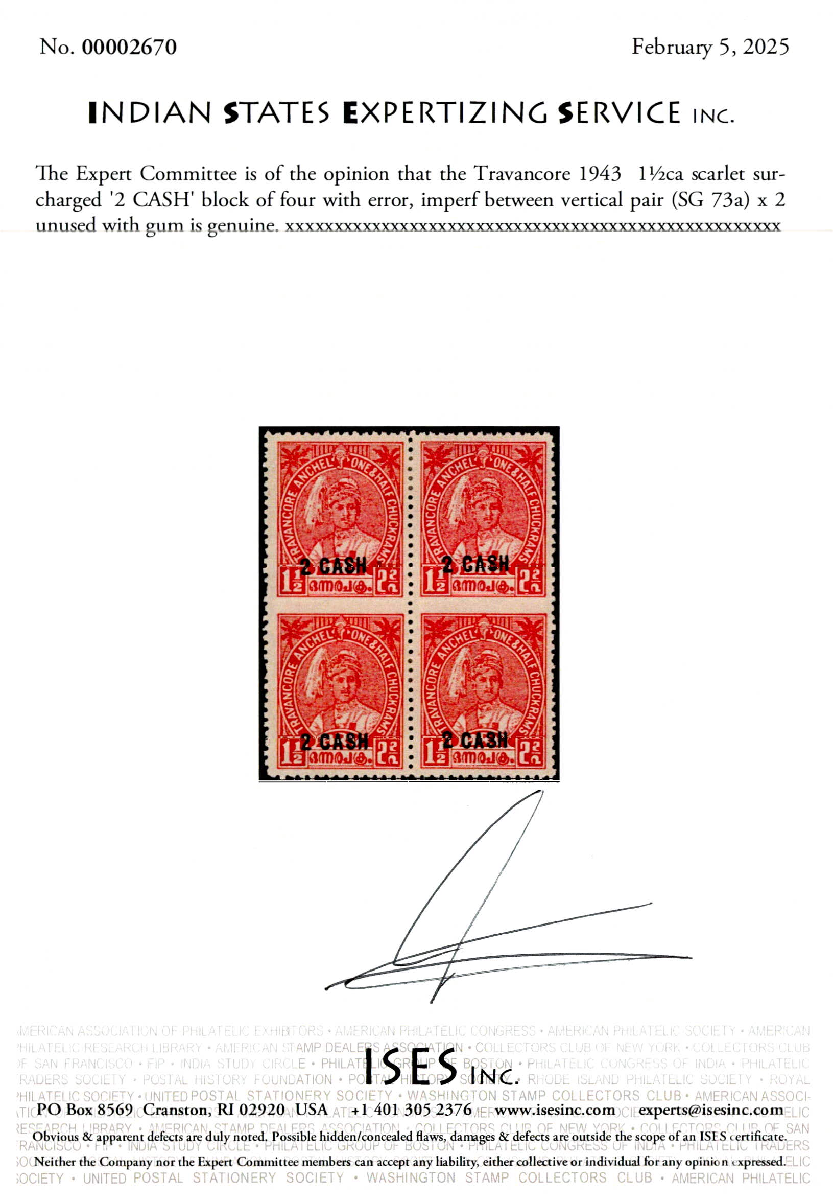 1943 1½ca scarlet surcharged '2 CASH' block of four with error, imperf between vertical pair x 2. 2025 ISES certificate.