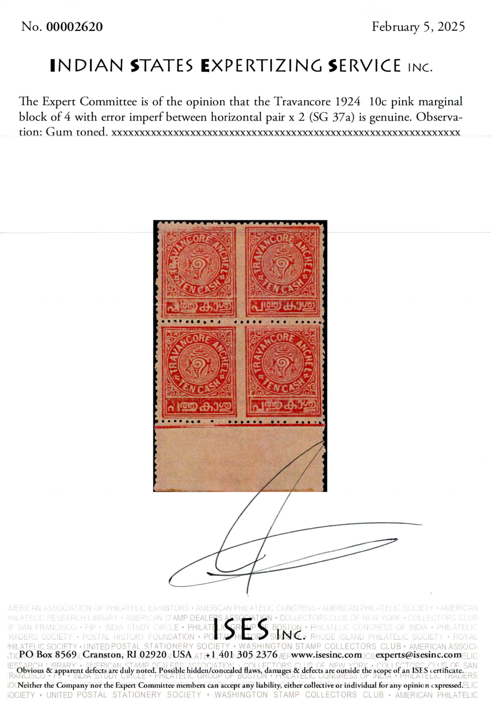 1924 10c pink marginal block of 4 with error imperf between horizontal pair x 2. Gum toned as usually found. 2025 ISES certificate.