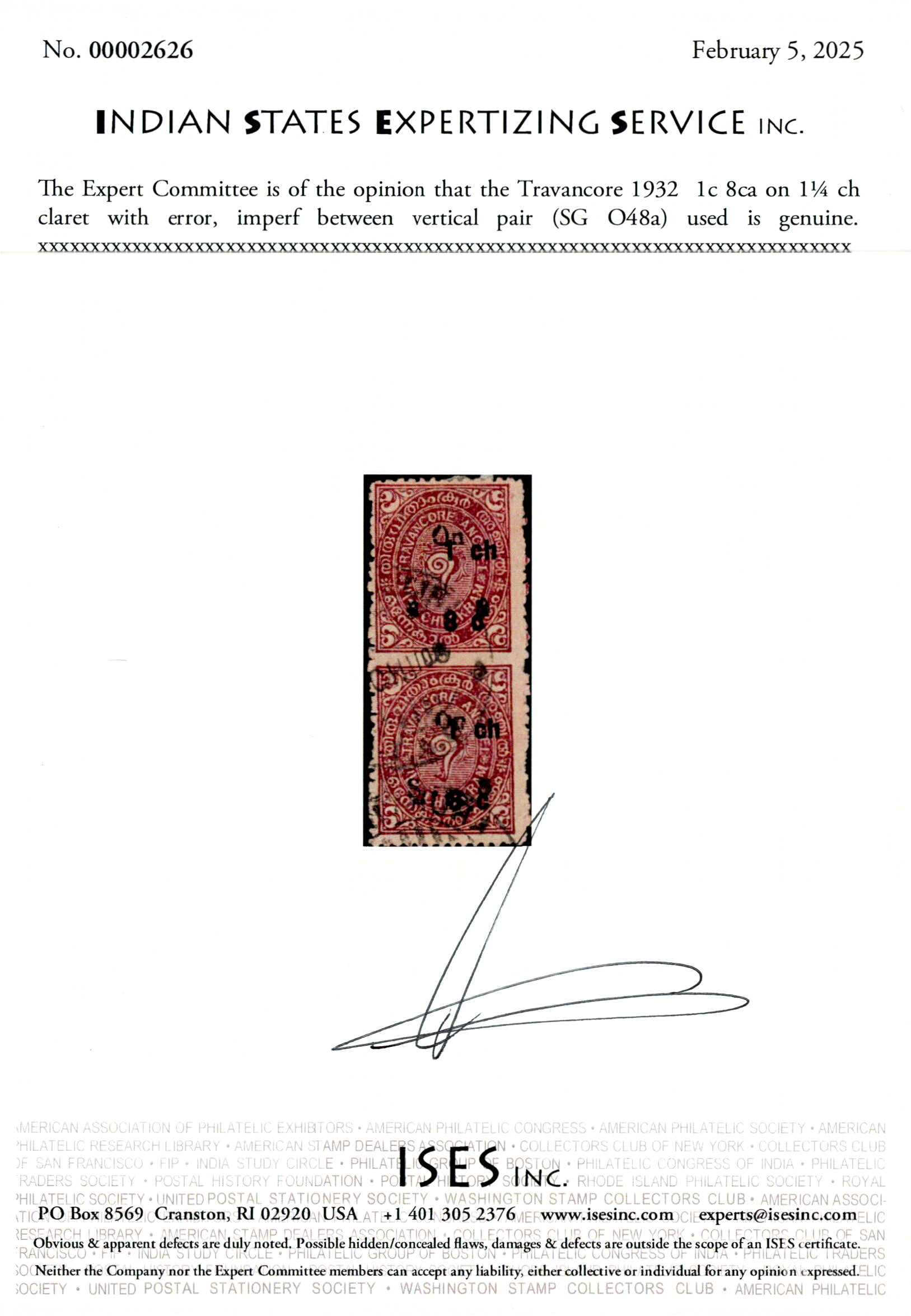 1932 1c 8ca on 1¼ ch claret vertical pair with error, imperf between vertical pair. 2025 ISES certificate.