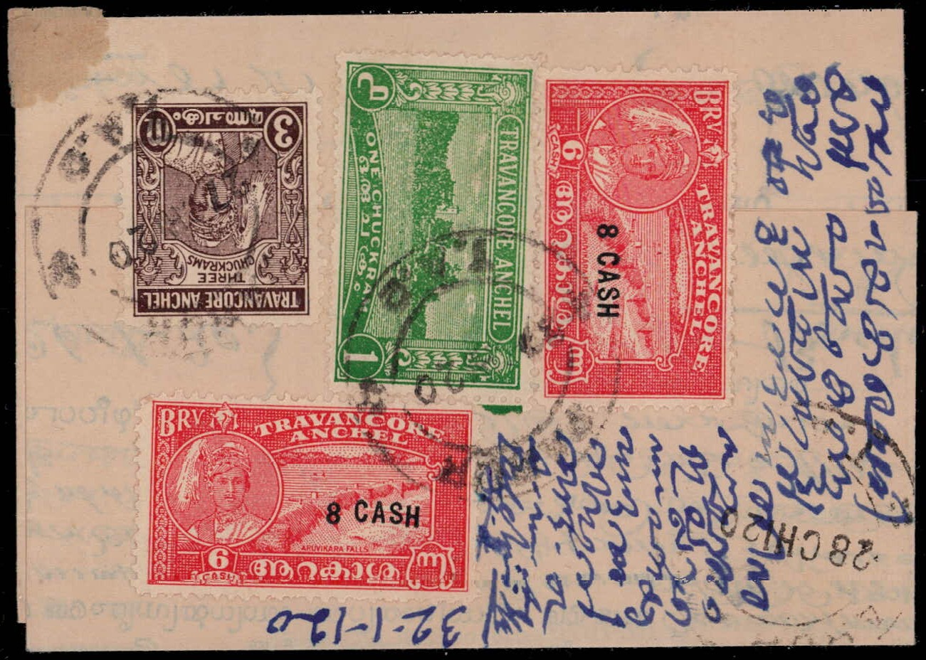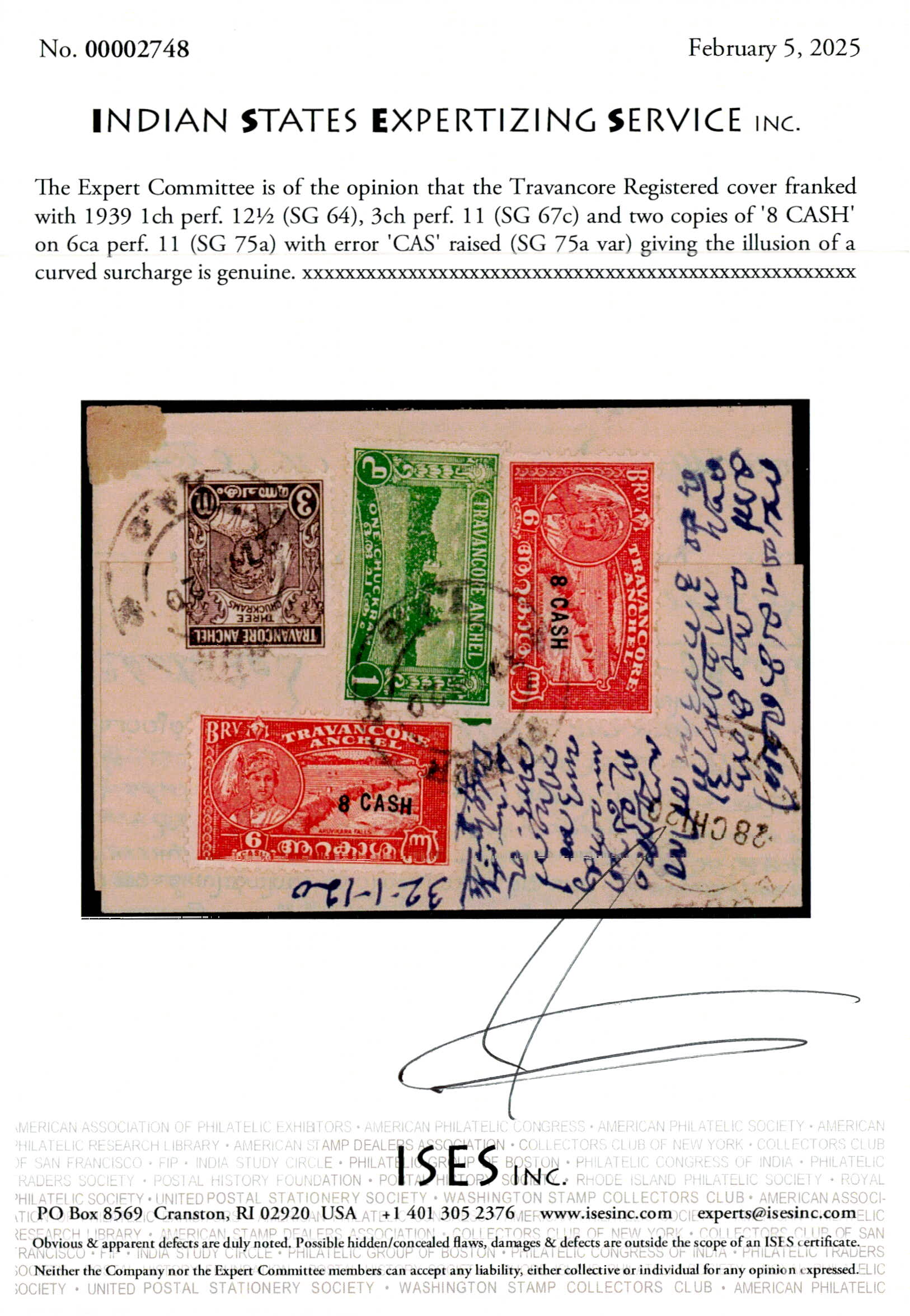 Registered cover franked with 1939 1ch perf. 12½, 3ch perf. 11 and two copies of '8 CASH' on 6ca with error 'CAS' raised giving the illusion of a curved surcharge. This is the first such example we have seen in 40 years. 2025 ISES certificate.