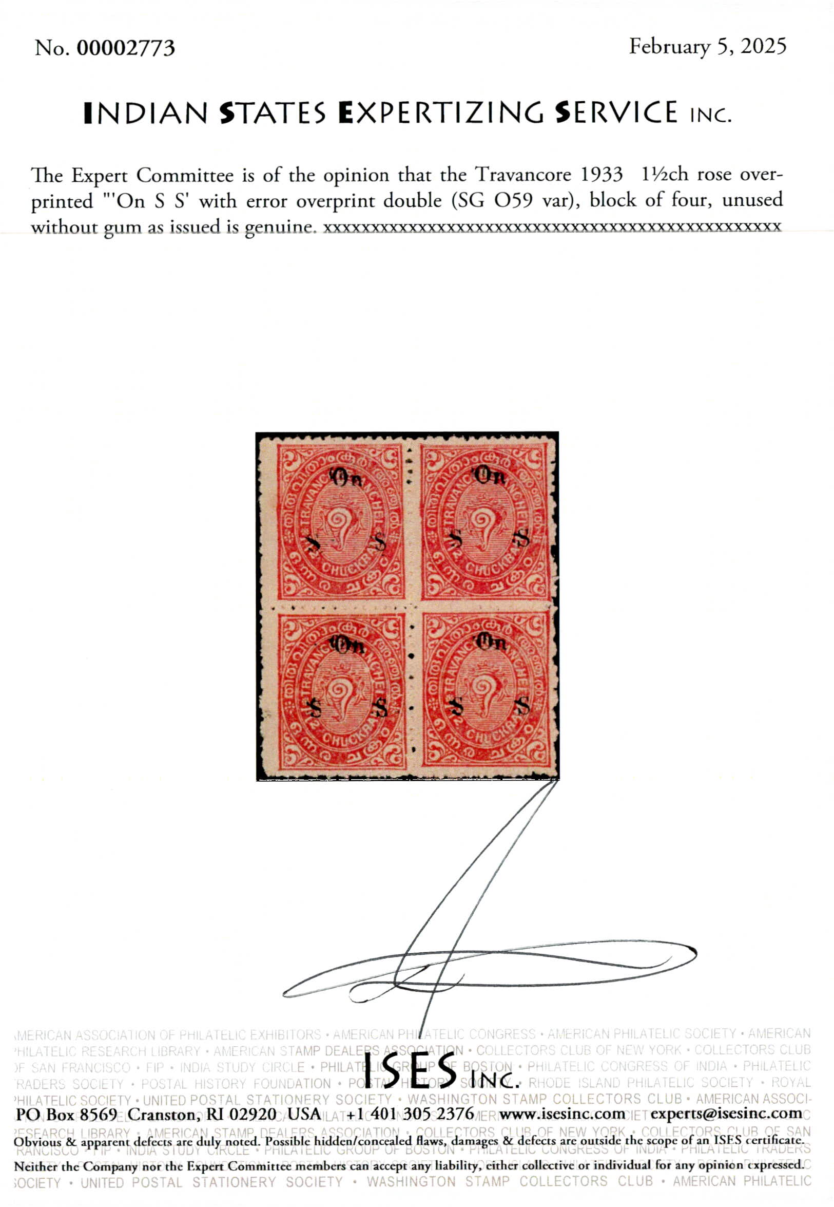 1933 1½ch rose overprinted "'On S S' with error overprint double, block of four. Not listed in SG. Unused without gum as issued. 2025 ISES certificate.