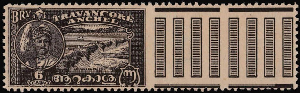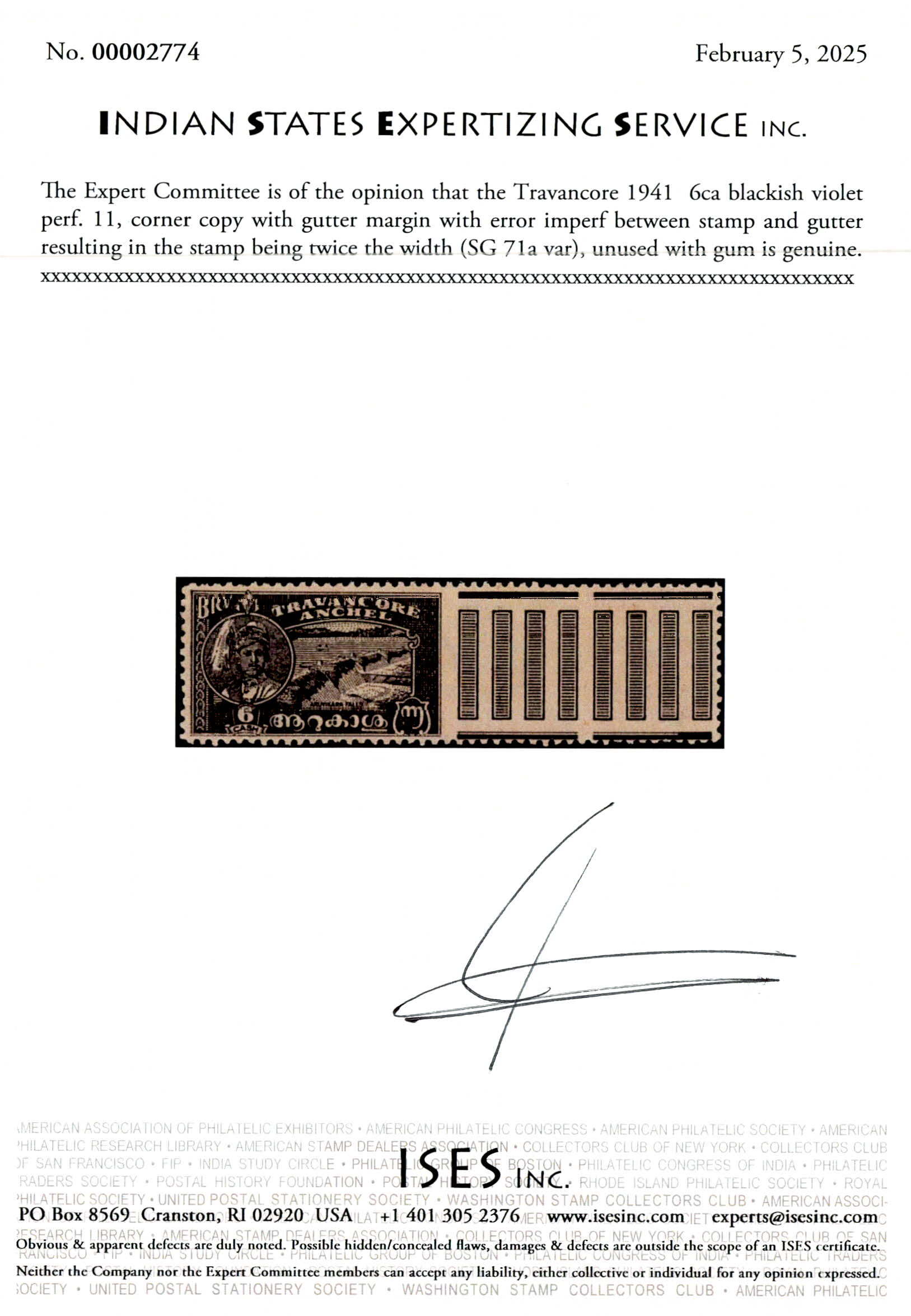 1941 6ca blackish violet perf. 11 with corner copy with gutter margin with error imperf between stamp and gutter resulting in the stamp being twice the width. An extraordinary and visually appealing. Unused without gum as issued. 2025 ISES certificate.