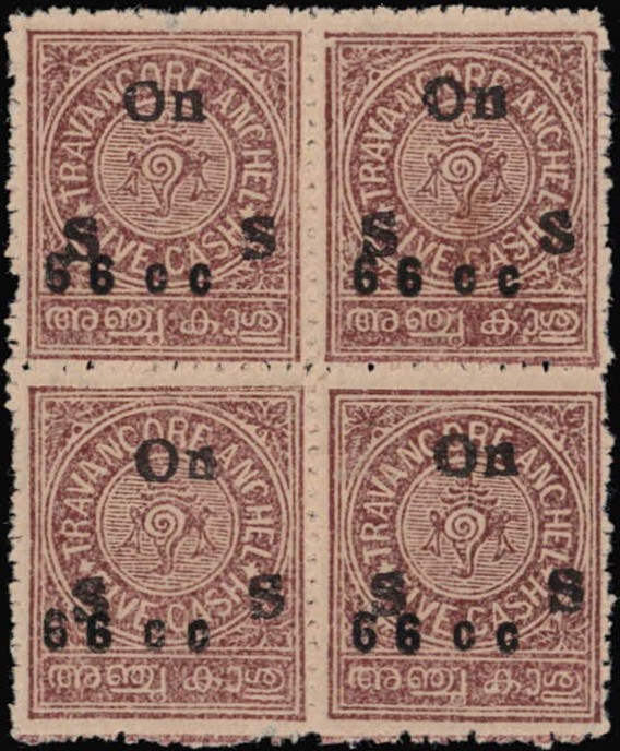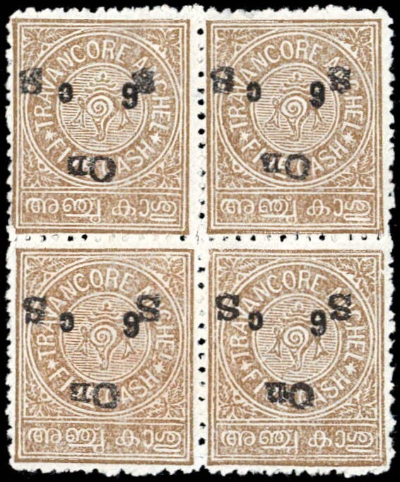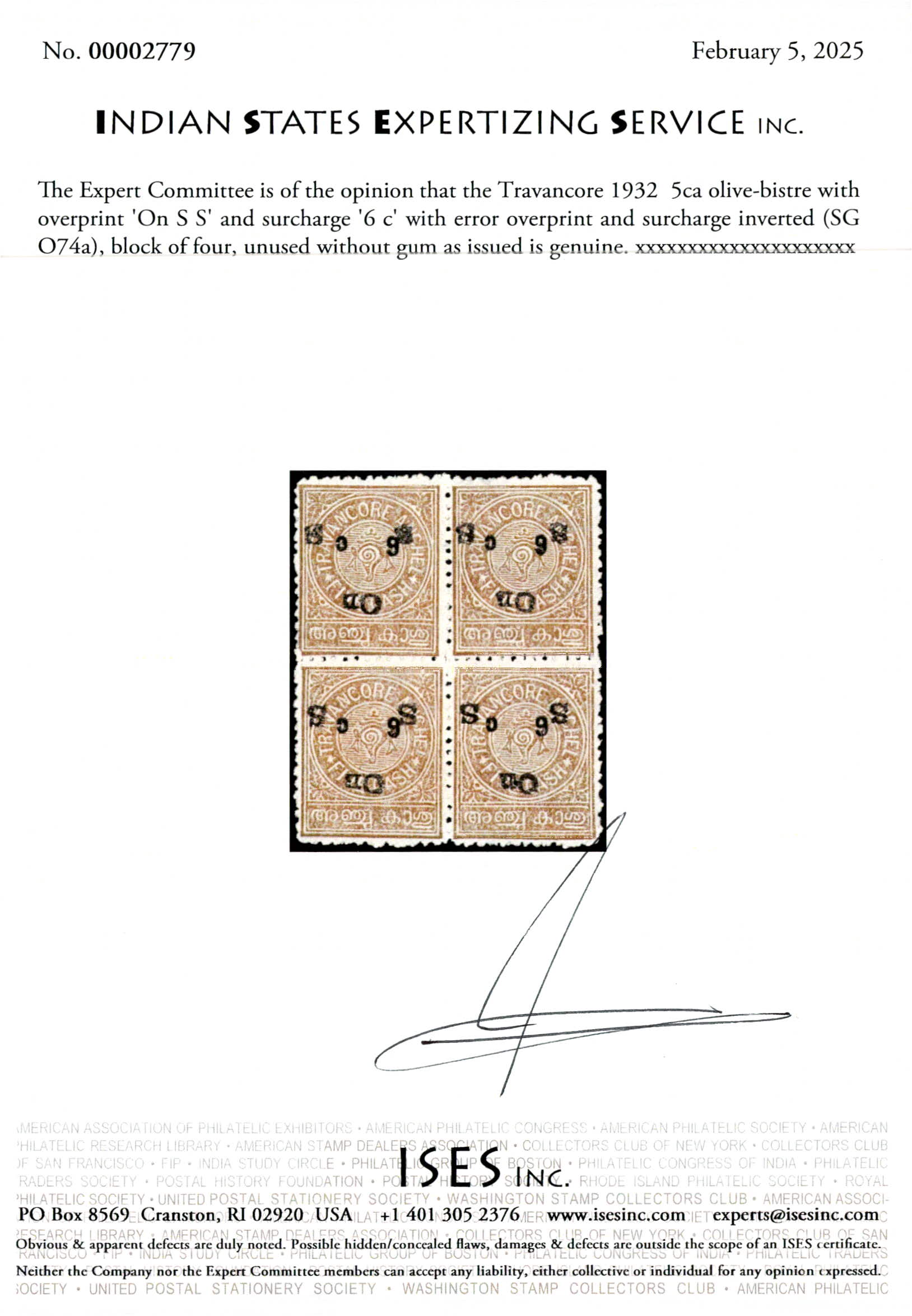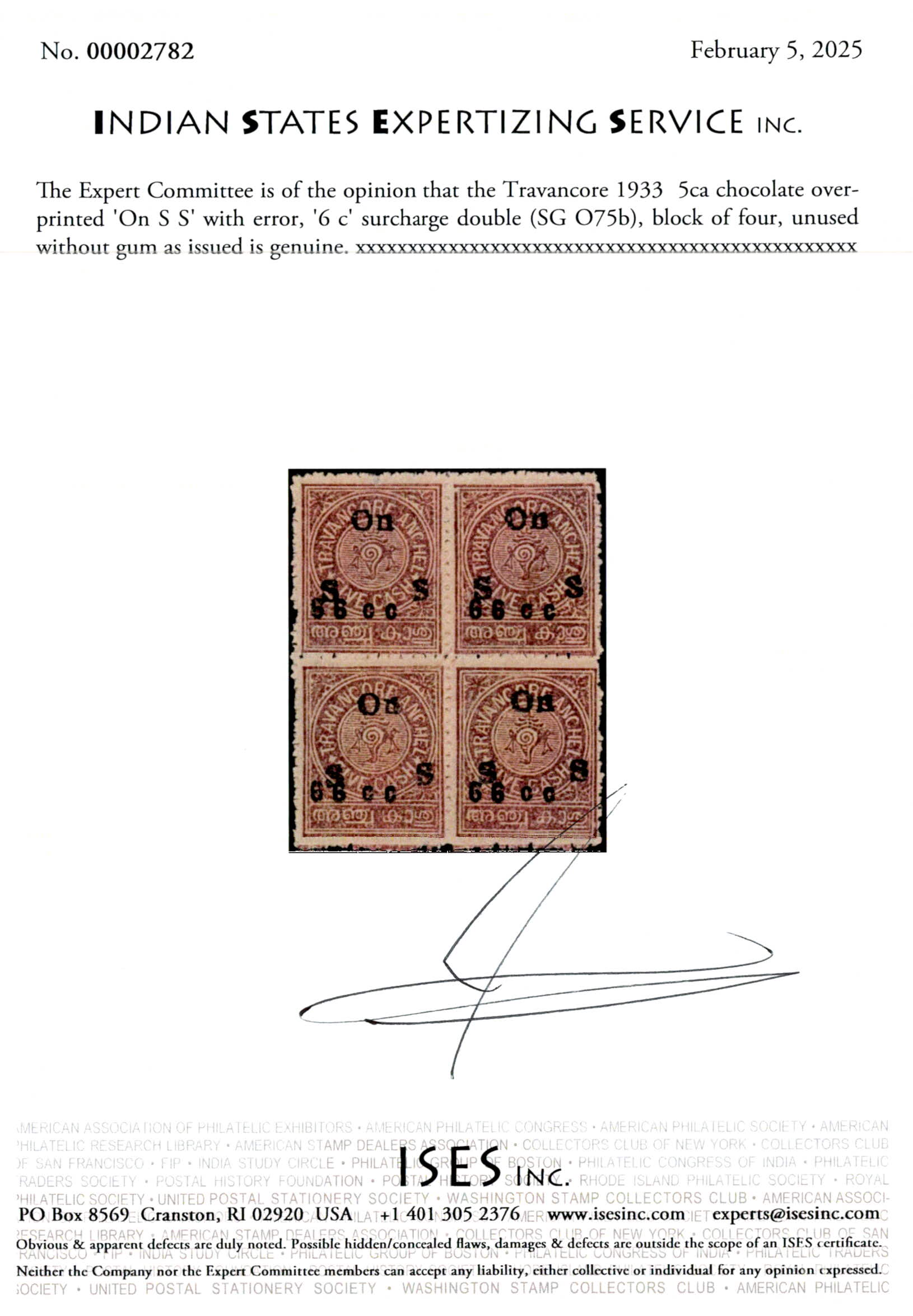 1933 5ca chocolate overprinted 'On S S' with error, '6 c' surcharge double, block of four. Unused without gum as issued. With Jal Cooper's signature on back. 2025 ISES certificate.