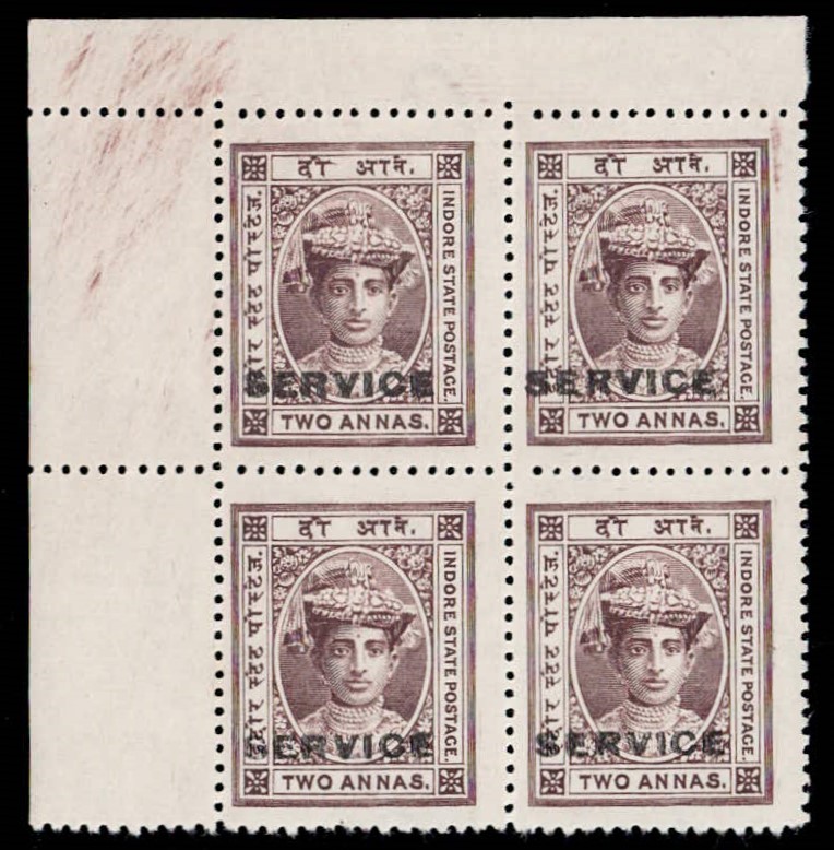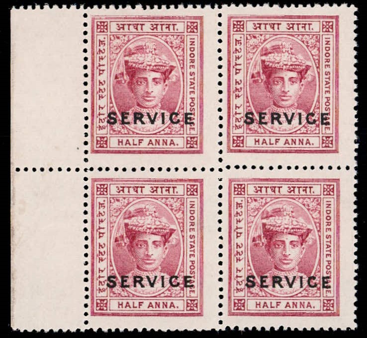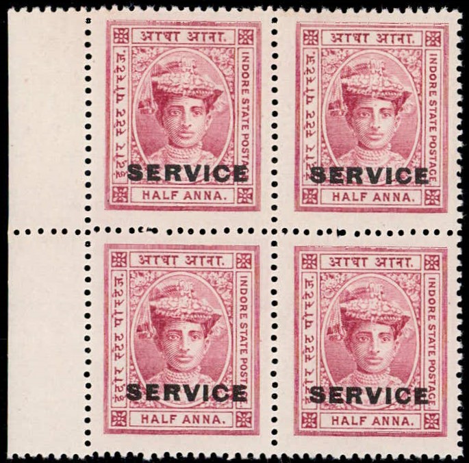 1905 ½a lake overprinted SERVICE, left corner marginal block of four.