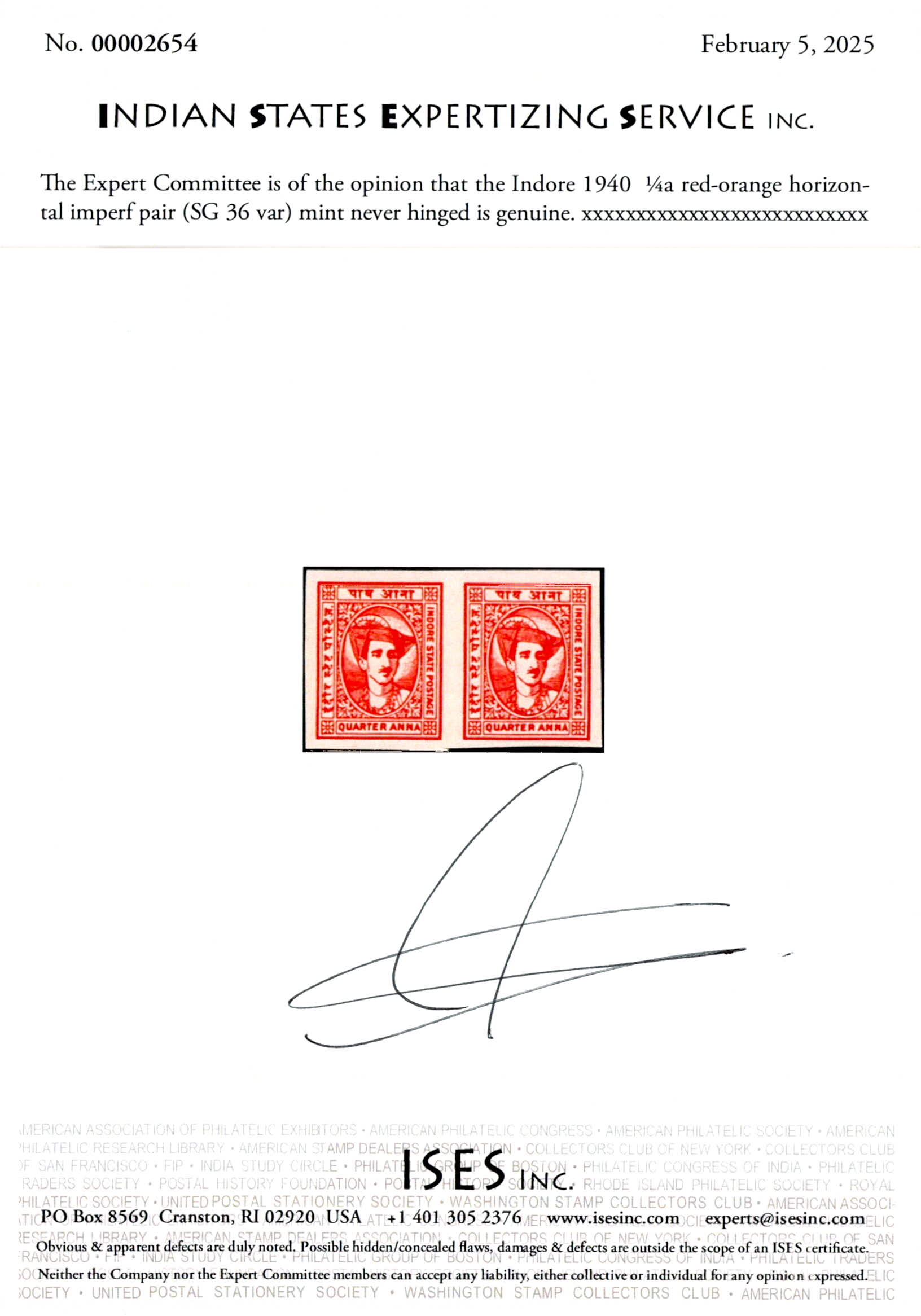 1940 ¼a red-orange horizontal imperf pair. This is from the unique discovery sheet of 80. Not listed in SG. 2025 ISES certificate.