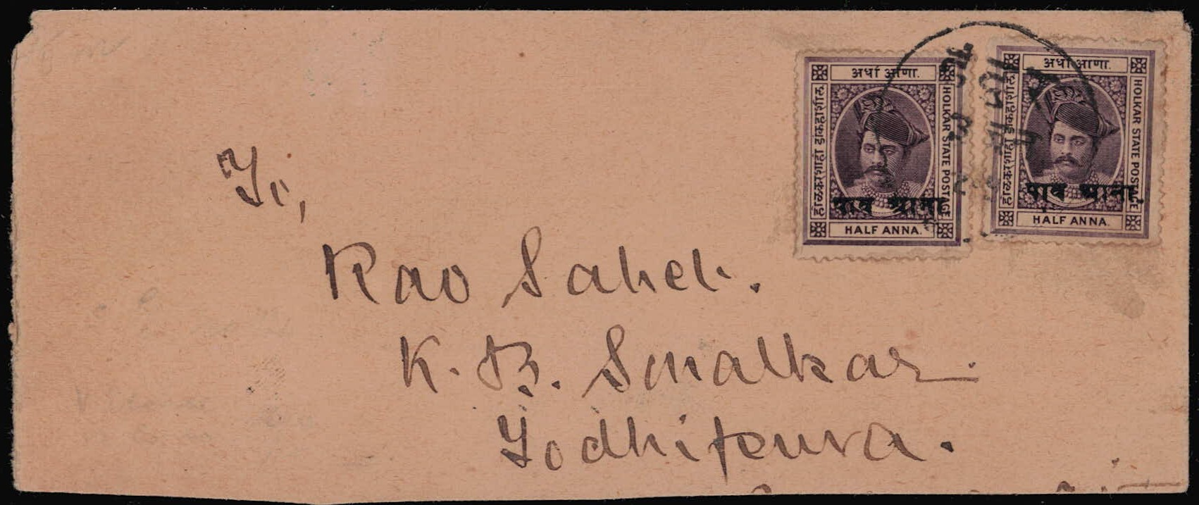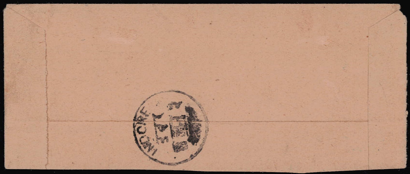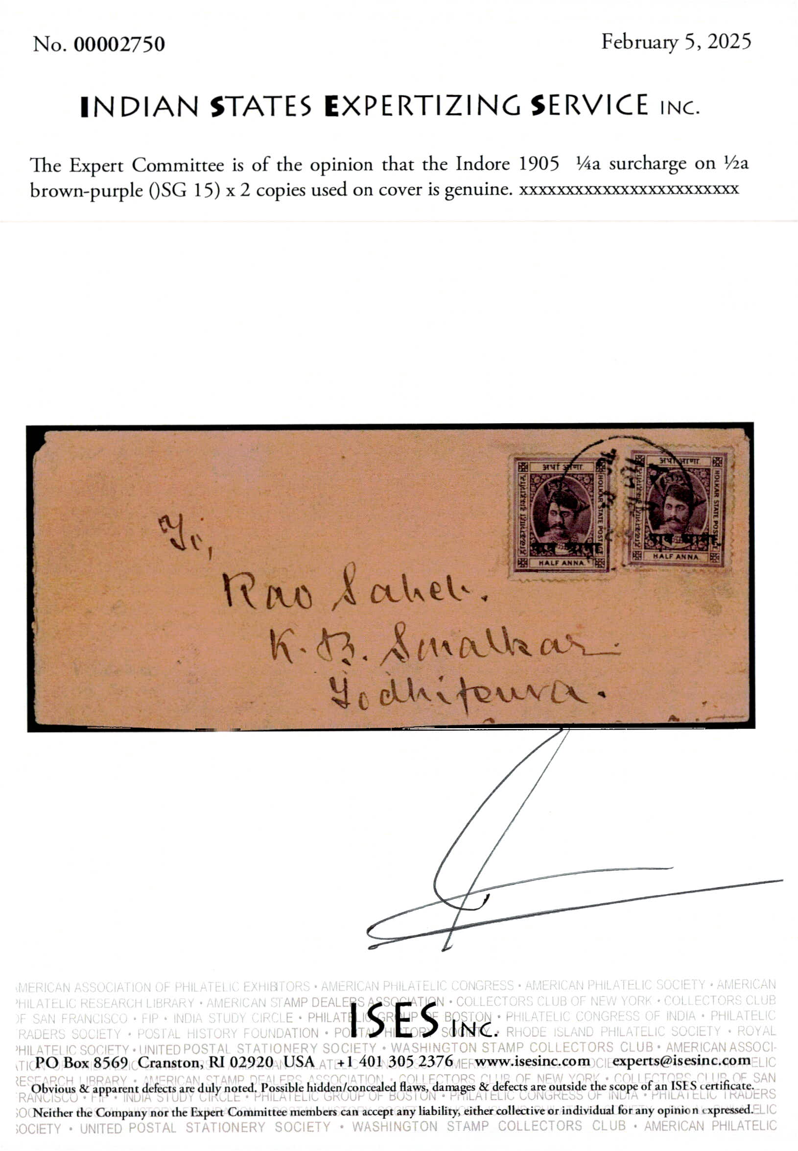 1905 ¼a surcharge on ½a brown-purple x 2 copies of local cover paying the ½ anna postal rate for single weight letter with delivery cds on reverse. 2025 ISES certificate.