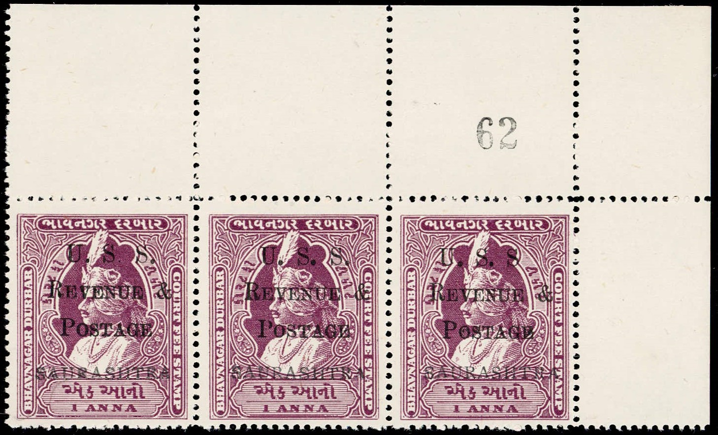 1949 1a Bhavnagar Court Fee stamp overprinted 'U. S. S. / REVENUE & / POSTAGE / SAURASHTRA' corner marginal horizontal strip of three with error, stop missing after last 'S' on third stamp. Ex. Dr. E.D. Pereira collection.