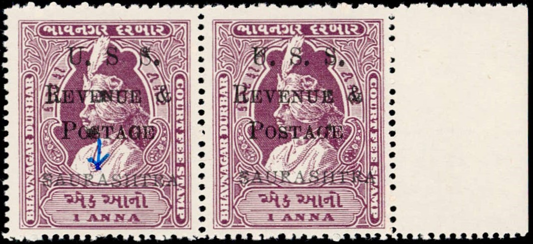 1949 1a Bhavnagar Court Fee stamp overprinted 'U. S. S. / REVENUE & / POSTAGE / SAURASHTRA' horizontal marginal pair with error, stop missing after first 'S' on left stamp. Ex. Dr. E.D. Pereira collection.