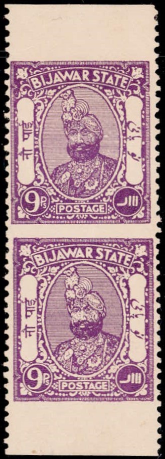 1935 9p violet vertical pair with error, imperforate horizontally. Gum toned with thin.