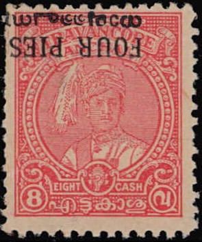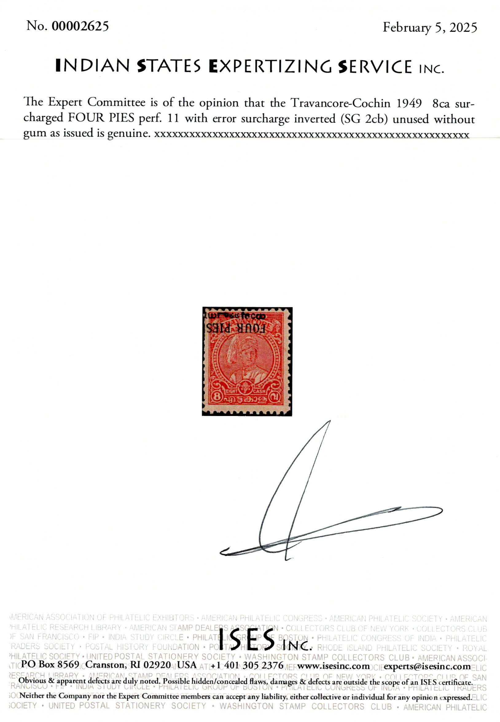 1949 8ca surcharged FOUR PIES perf. 11 with error surcharge inverted. 2025 ISES certificate.